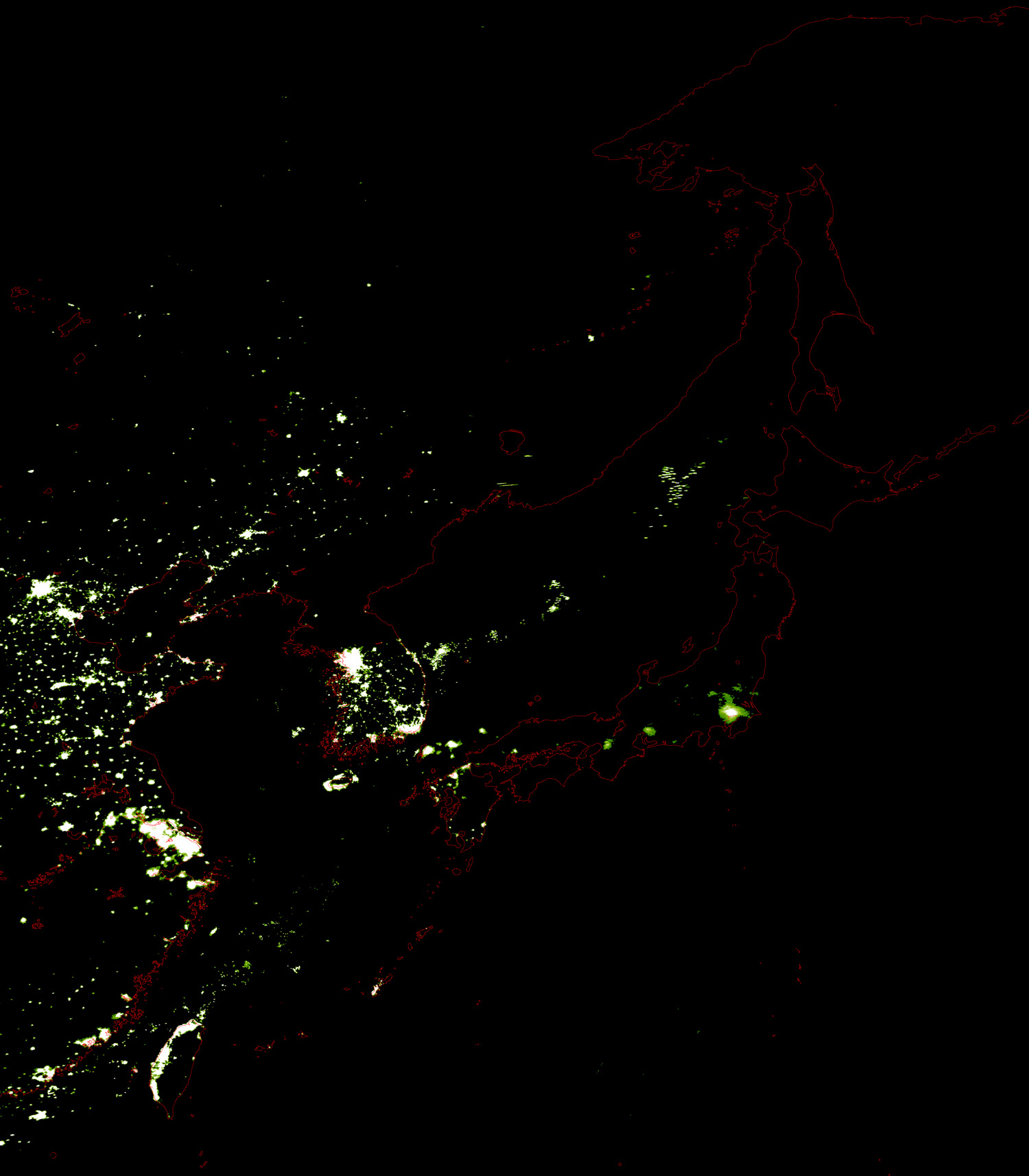 o 2010년 09월 27일 20시 15분 DMSP/OLS(Detense Meteorological Satellite Program/Operating Linescan System) 영상입니다. o DMSP/OLS는 야간 불빛을 탐지하는 위성으로, 야간 조업 어선 분포 현황을 알 수 있습니다. o 그림을 클릭하시면 크게 보실 수 있습니다.