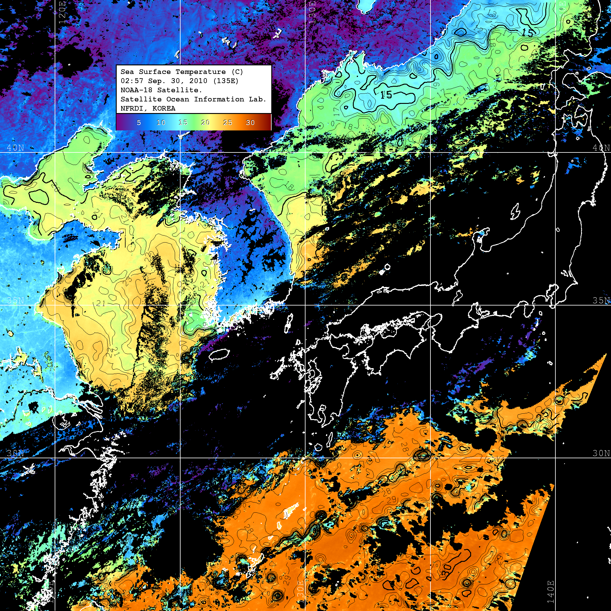 o 2010년 09월 30일 02시 57분 NOAA-18호 위성영상입니다. o 수온분포는 범례를 참고하시기 바랍니다. o 검은색은 구름을 나타냅니다. o 그림을 클릭하시면 크게 보실 수 있습니다.