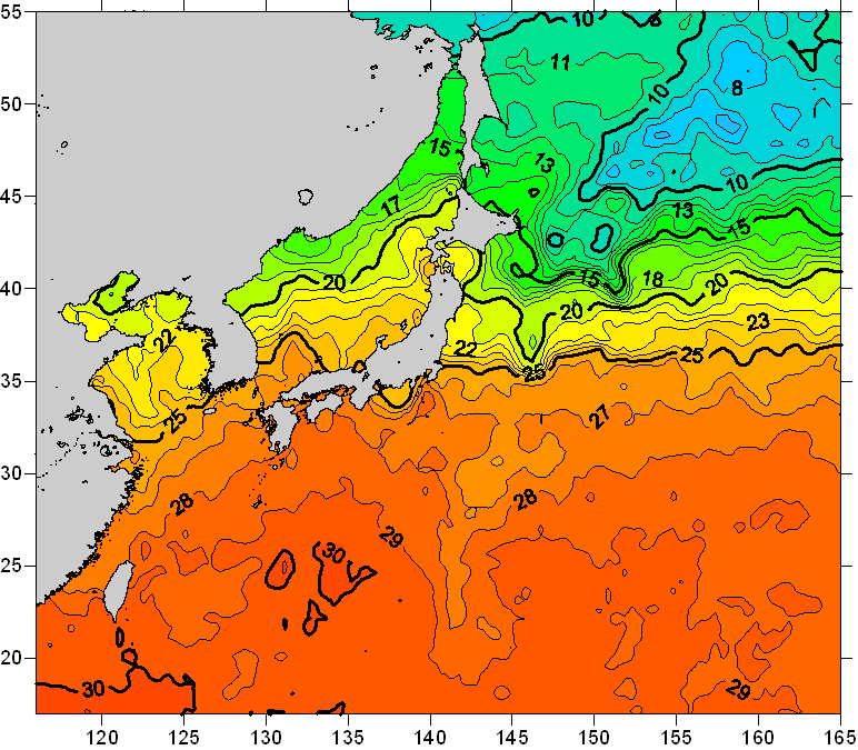 o 2010년 09월 29일 북서태평양 광역해양 수온분포 입니다. o 아래 위성 수온분포도는 국립수산과학원(NFRDI, Korea)과 일본동북대학교 (Tohoku University, Japan)가 공동연구개발 진행중, 1차 연구결과인 것으로 구름의 영향을 배제한 신기술의 수온정보입니다.