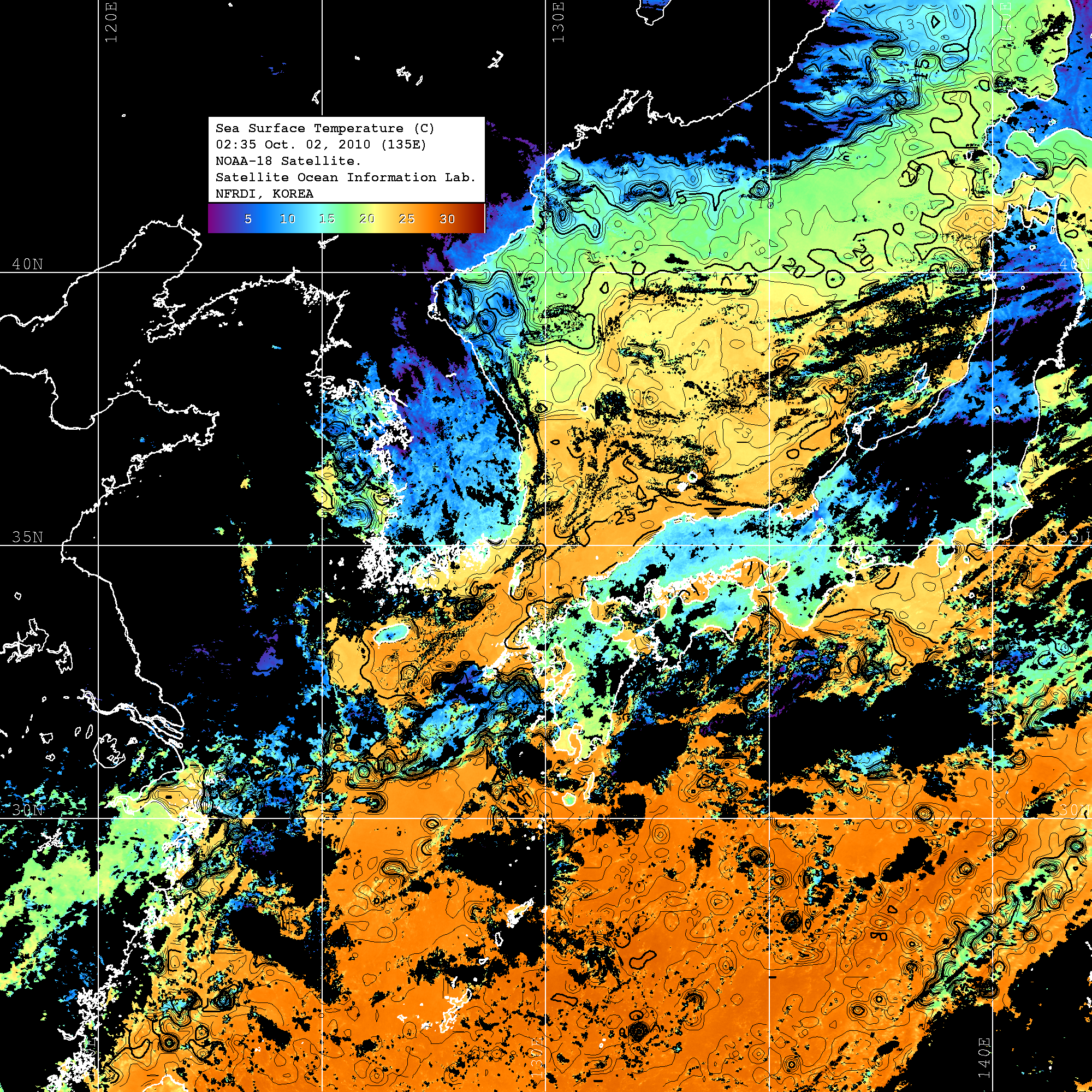 o 2010년 10월 02일 02시 35분 NOAA-18호 위성영상입니다. o 수온분포는 범례를 참고하시기 바랍니다. o 검은색은 구름을 나타냅니다. o 그림을 클릭하시면 크게 보실 수 있습니다.