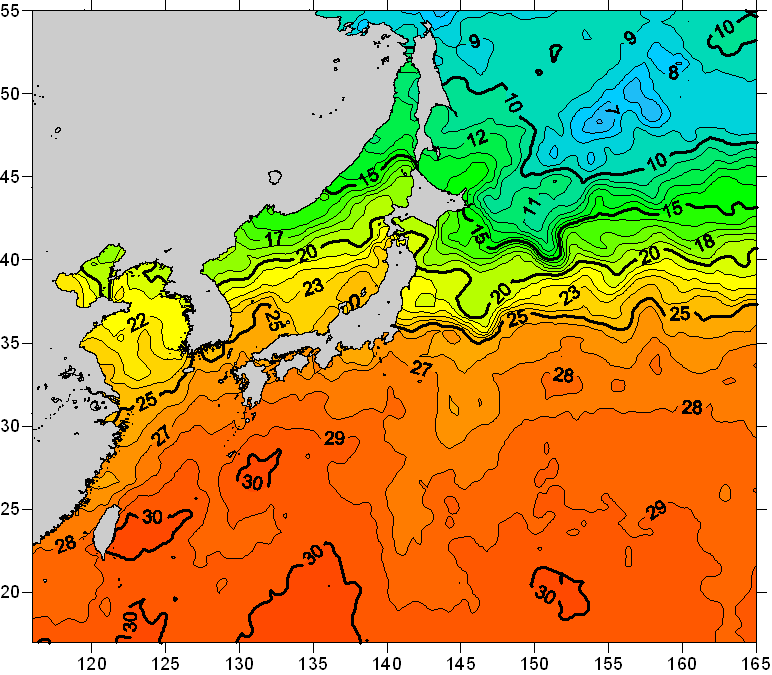 o 2010년 10월 03일 북서태평양 광역해양 수온분포 입니다. o 아래 위성 수온분포도는 국립수산과학원(NFRDI, Korea)과 일본동북대학교 (Tohoku University, Japan)가 공동연구개발 진행중, 1차 연구결과인 것으로 구름의 영향을 배제한 신기술의 수온정보입니다.