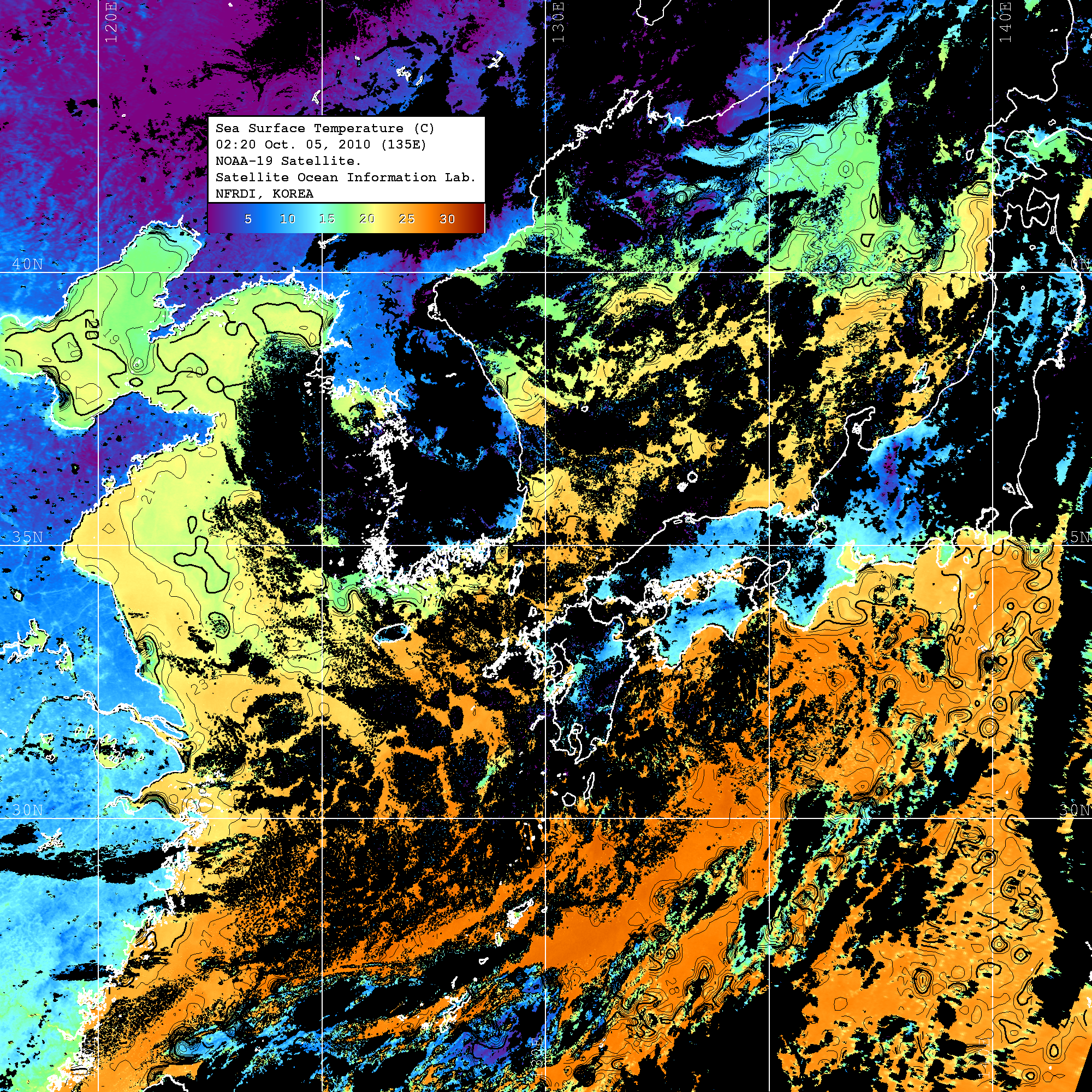 o 2010년 10월 05일 02시 20분 NOAA-19호 위성영상입니다. o 수온분포는 범례를 참고하시기 바랍니다. o 검은색은 구름을 나타냅니다. o 그림을 클릭하시면 크게 보실 수 있습니다.