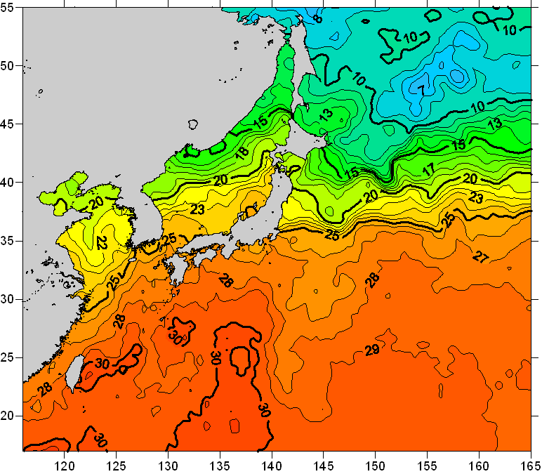 o 2010년 10월 04일 북서태평양 광역해양 수온분포 입니다. o 아래 위성 수온분포도는 국립수산과학원(NFRDI, Korea)과 일본동북대학교 (Tohoku University, Japan)가 공동연구개발 진행중, 1차 연구결과인 것으로 구름의 영향을 배제한 신기술의 수온정보입니다.