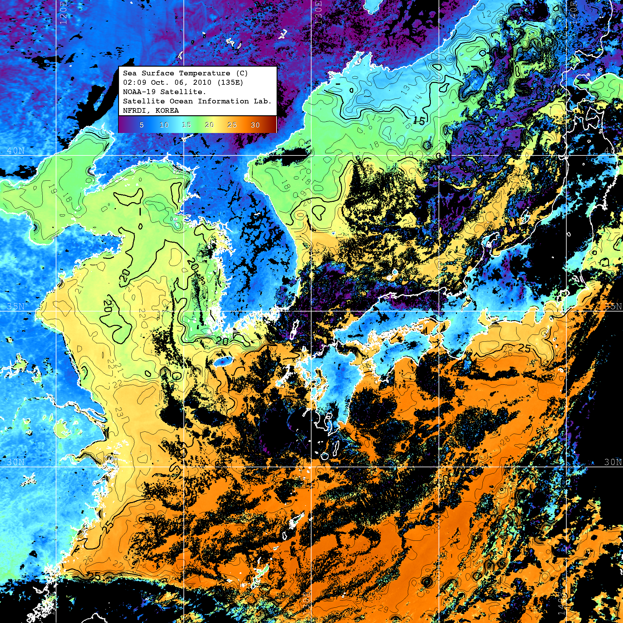 o 2010년 10월 06일 02시 09분 NOAA-19호 위성영상입니다. o 수온분포는 범례를 참고하시기 바랍니다. o 검은색은 구름을 나타냅니다. o 그림을 클릭하시면 크게 보실 수 있습니다.