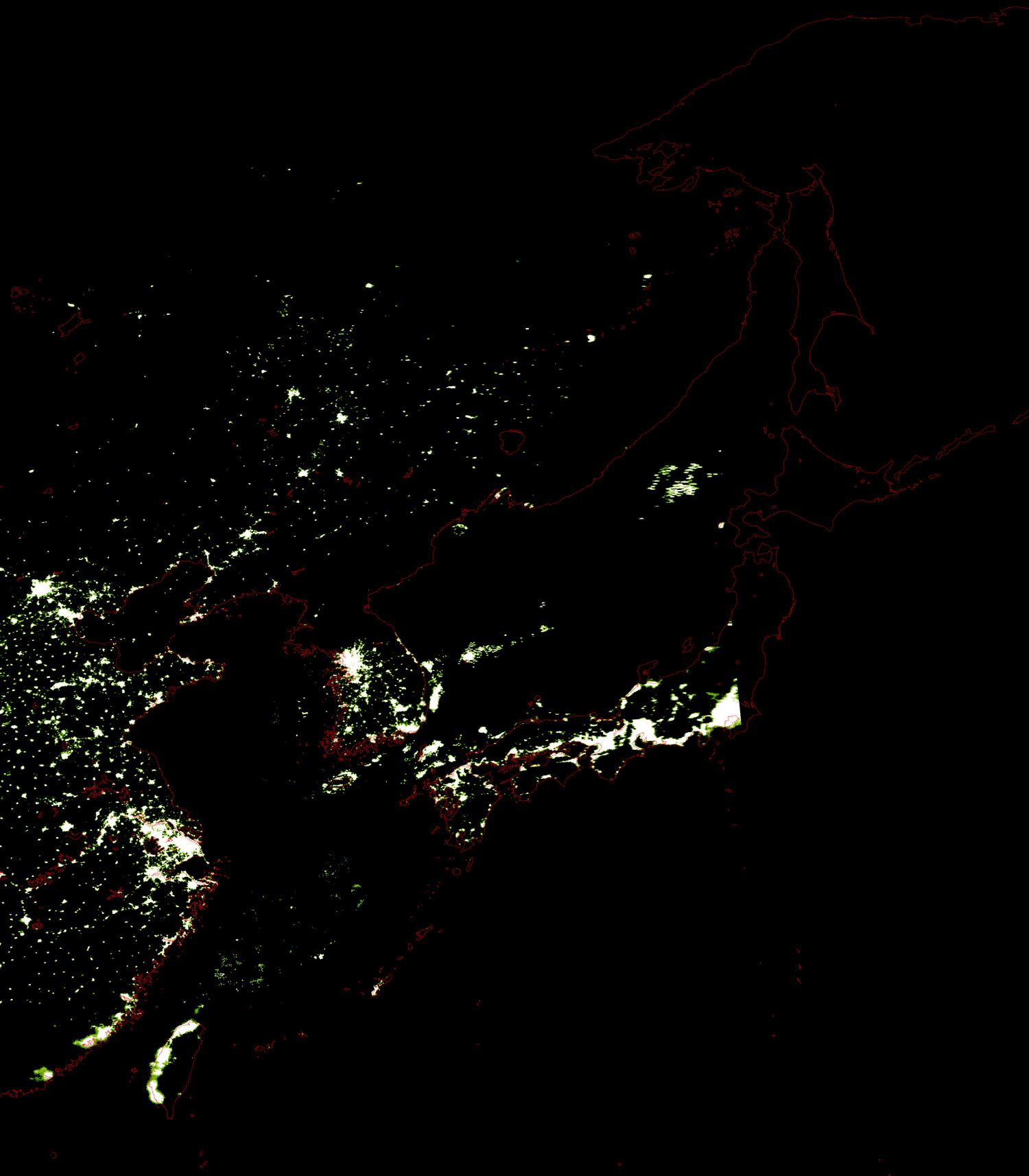 오늘의 DMSP/OLS 영상 o 2010년 10월 05일 20시 21분 DMSP/OLS(Detense Meteorological Satellite Program/Operating Linescan System) 영상입니다. o DMSP/OLS는 야간 불빛을 탐지하는 위성으로, 야간 조업 어선 분포 현황을 알 수 있습니다. o 그림을 클릭하시면 크게 보실 수 있습니다.