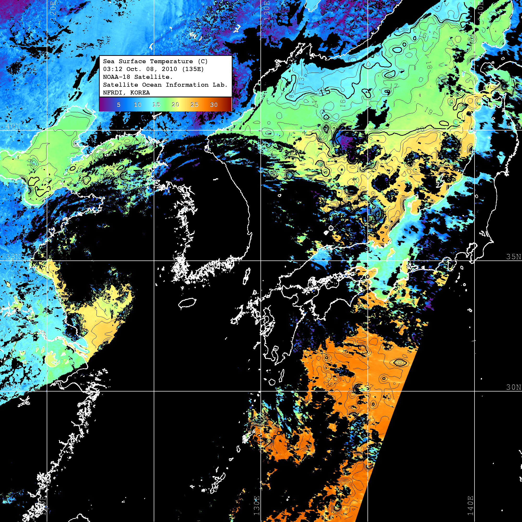 o 2010년 10월 08일 03시 12분 NOAA-18호 위성영상입니다. o 수온분포는 범례를 참고하시기 바랍니다. o 검은색은 구름을 나타냅니다. o 그림을 클릭하시면 크게 보실 수 있습니다.
