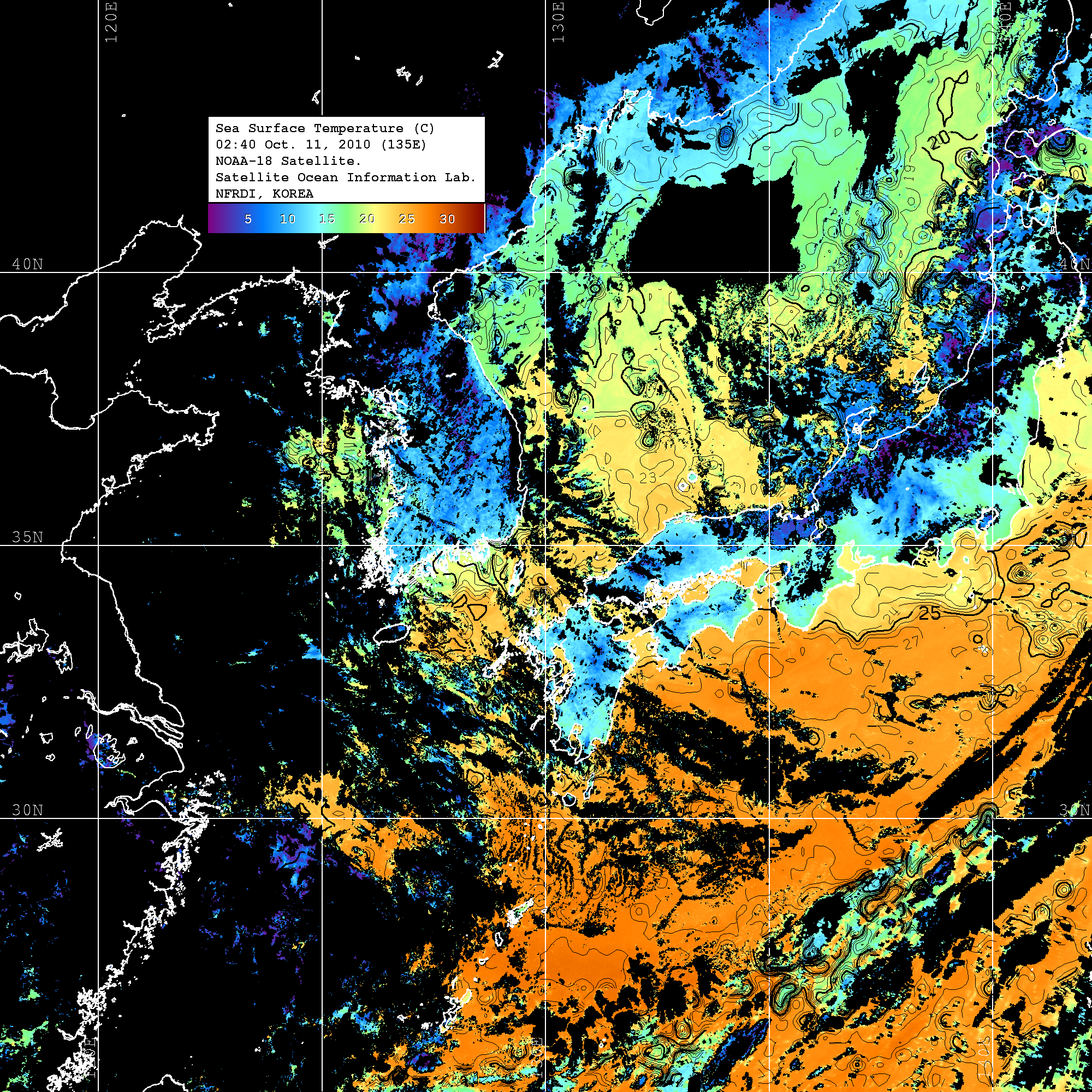 o 2010년 10월 11일 02시 40분 NOAA-18호 위성영상입니다. o 수온분포는 범례를 참고하시기 바랍니다. o 검은색은 구름을 나타냅니다. o 그림을 클릭하시면 크게 보실 수 있습니다.