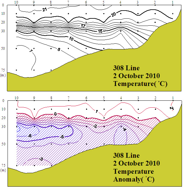 ㅇ 2010년 10월 2일 국립수산과학원 서해수산연구소에서 조사한 308선(대천 서방)의 수직수온분포도 및 평년편차도입니다.