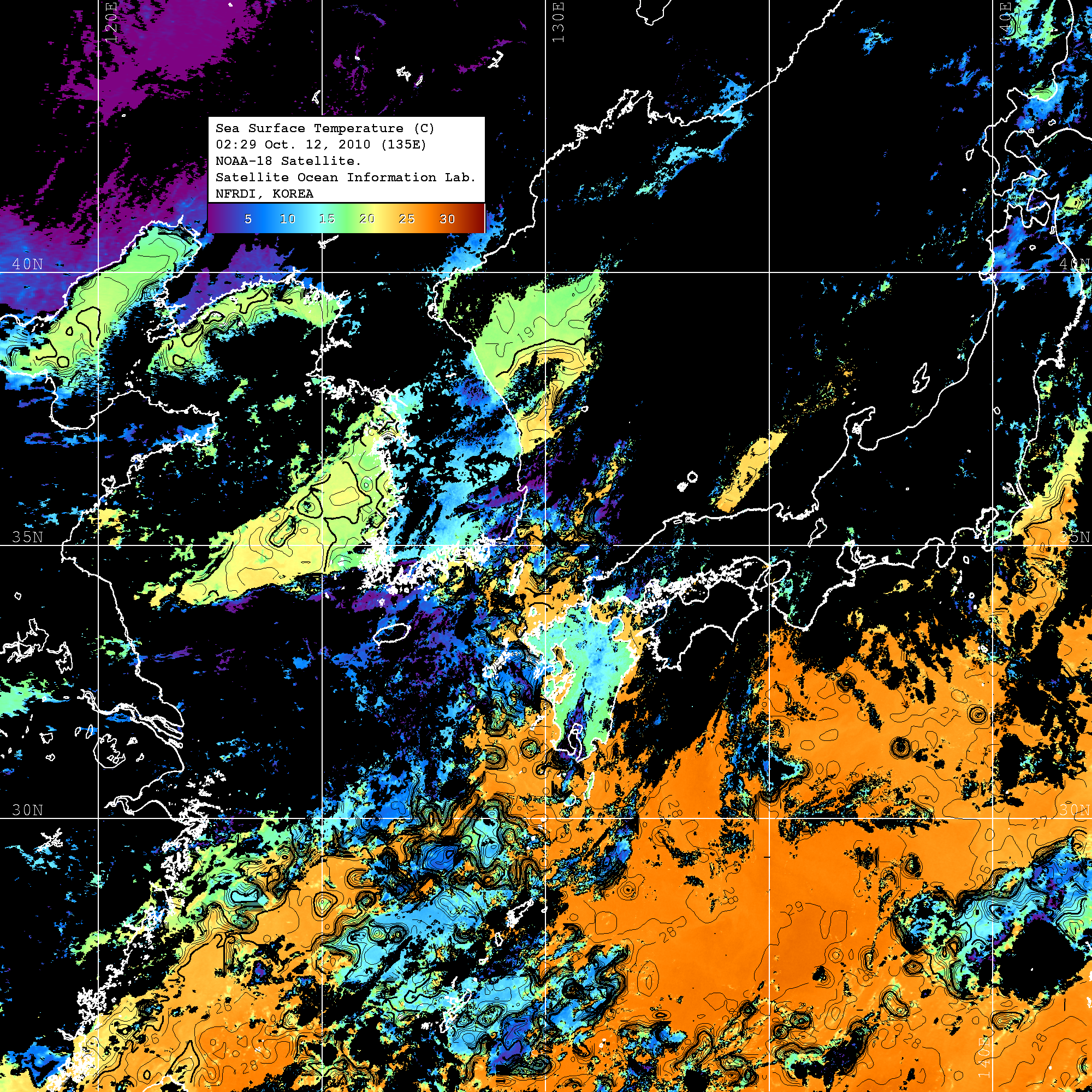 o 2010년 10월 12일 02시 29분 NOAA-18호 위성영상입니다. o 수온분포는 범례를 참고하시기 바랍니다. o 검은색은 구름을 나타냅니다. o 그림을 클릭하시면 크게 보실 수 있습니다.