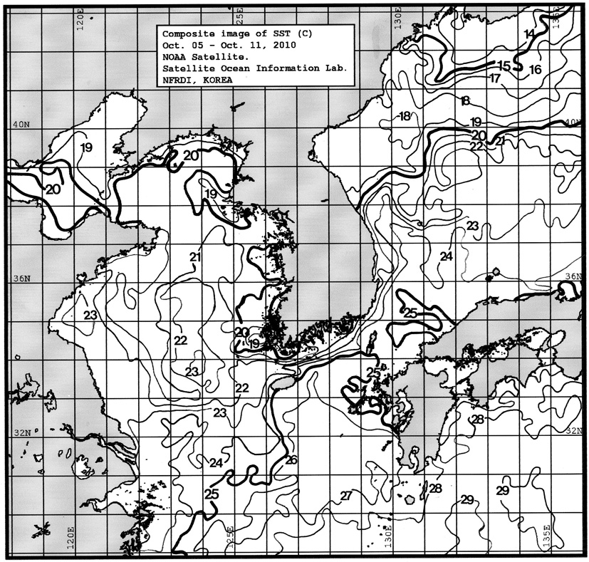 o 금주(2010.10.05~2010.10.11)의 한국근해 표면수온은 대화퇴 근해 21~22도, 울릉도 근해 22~23도, 대마도 근해 24~25도, 제주도 근해 24~25도, 이어도 근해 23~24도, 가거초 근해 21~22도, 어청도 근해 20~21도로 나타납니다. o「평년에 비해」대화퇴 근해 1.3도 높게, 울릉도 근해 0.4도 높게, 대마도 근해 비슷하게, 제주도 근해 0.5도 높게, 이어도, 가거초 및 어청도 근해는 비슷하게 나타납니다. o「전년에 비해」대화퇴 근해 0.5도 높게, 울릉도 근해 비슷하게, 대마도 근해 0.5도 낮게, 제주도 근해 비슷하게, 이어도 근해 0.5도 낮게, 가거초 근해 1.0도 낮게, 어청도 근해는 1.0도 낮게 나타납니다. o 수온 전선대는 우리나라 제주해협에서 대한해협까지 24도를 중심으로 형성됩니다.