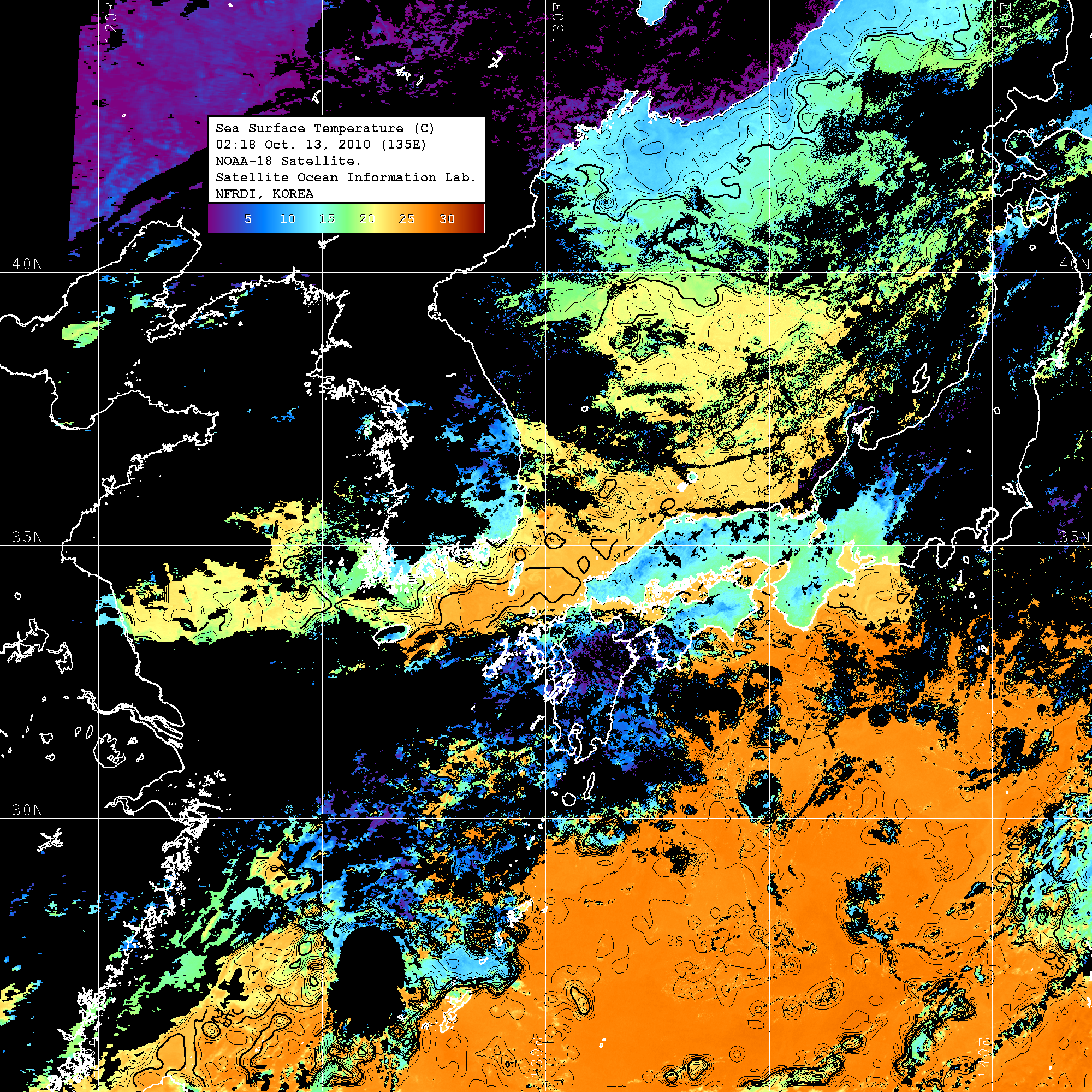 o 2010년 10월 13일 02시 18분 NOAA-18호 위성영상입니다. o 수온분포는 범례를 참고하시기 바랍니다. o 검은색은 구름을 나타냅니다. o 그림을 클릭하시면 크게 보실 수 있습니다.