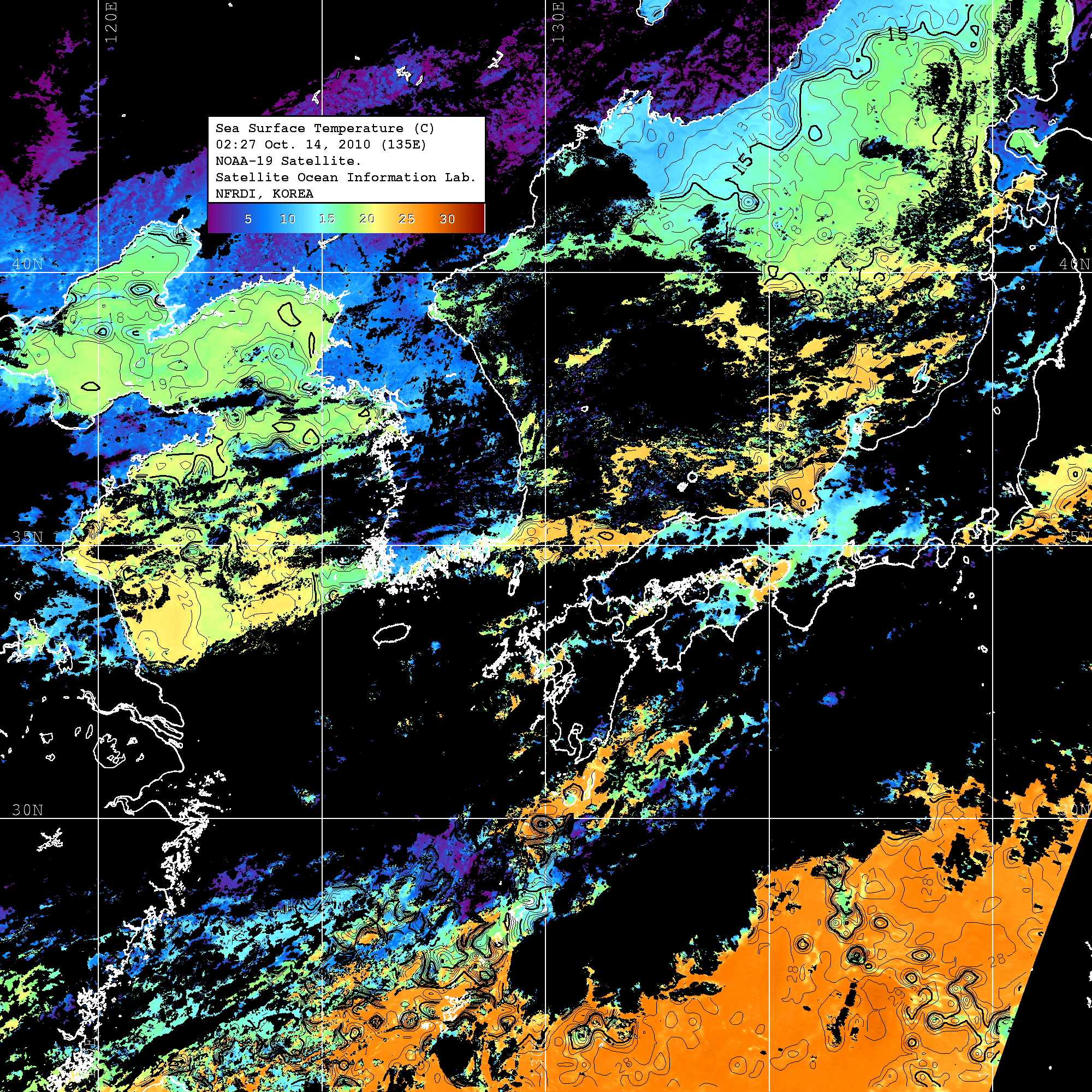 o 2010년 10월 14일 02시 27분 NOAA-19호 위성영상입니다. o 수온분포는 범례를 참고하시기 바랍니다. o 검은색은 구름을 나타냅니다. o 그림을 클릭하시면 크게 보실 수 있습니다.