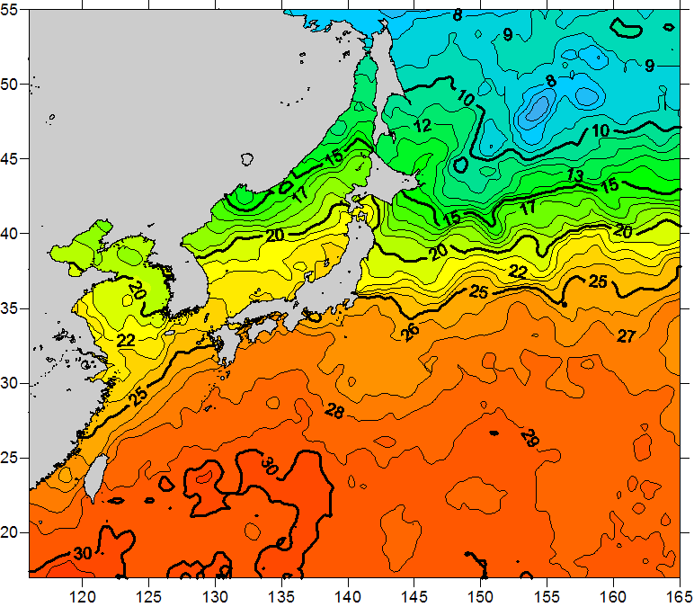 o 2010년 10월 15일 북서태평양 광역해양 수온분포 입니다. o 아래 위성 수온분포도는 국립수산과학원(NFRDI, Korea)과 일본동북대학교 (Tohoku University, Japan)가 공동연구개발 진행중, 1차 연구결과인 것으로 구름의 영향을 배제한 신기술의 수온정보입니다.