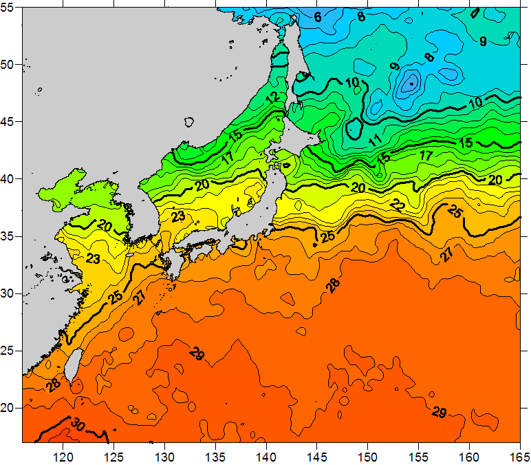 o 2010년 10월 17일 북서태평양 광역해양 수온분포 입니다. o 아래 위성 수온분포도는 국립수산과학원(NFRDI, Korea)과 일본동북대학교 (Tohoku University, Japan)가 공동연구개발 진행중, 1차 연구결과인 것으로 구름의 영향을 배제한 신기술의 수온정보입니다.