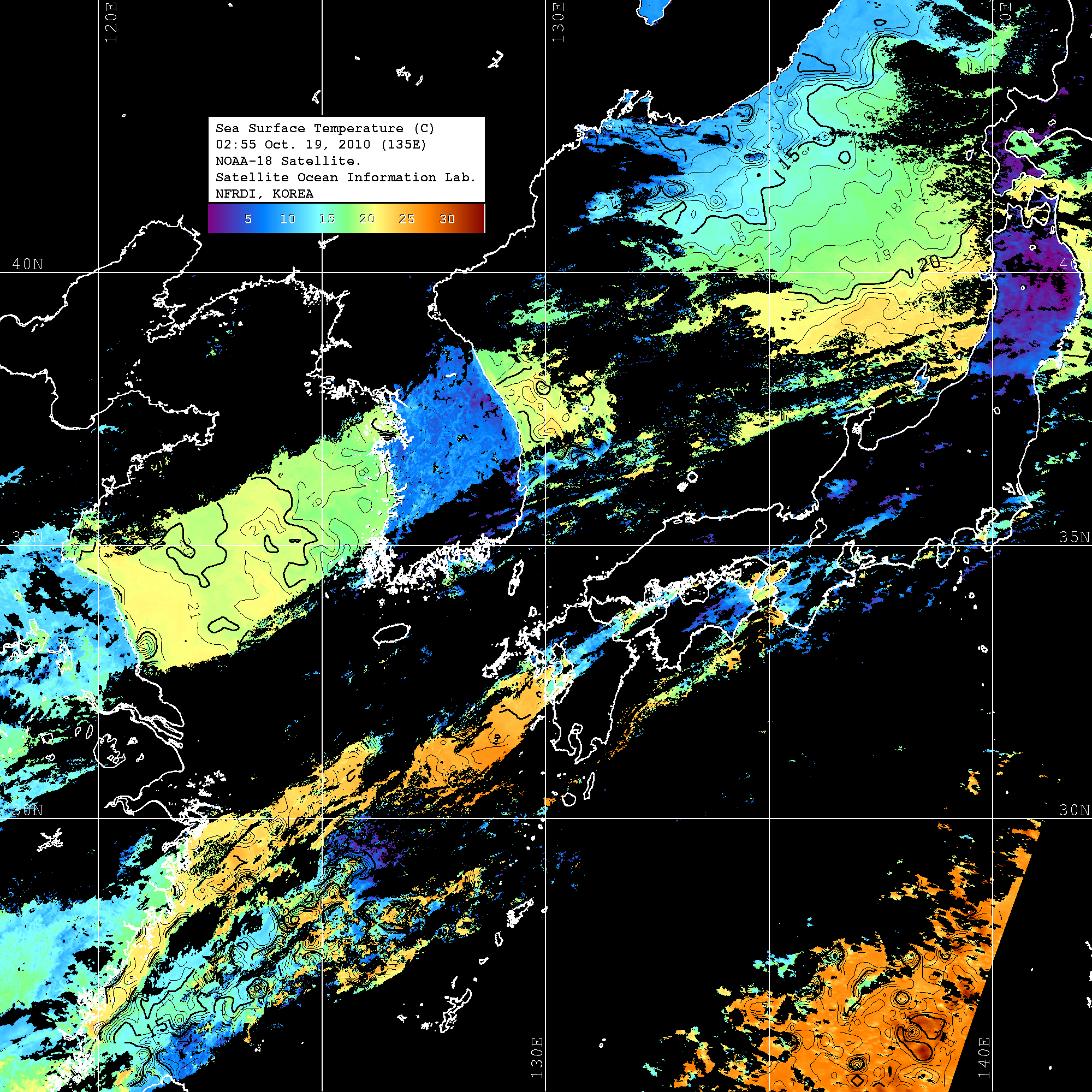 o 2010년 10월 19일 02시 55분 NOAA-18호 위성영상입니다. o 수온분포는 범례를 참고하시기 바랍니다. o 검은색은 구름을 나타냅니다. o 그림을 클릭하시면 크게 보실 수 있습니다.