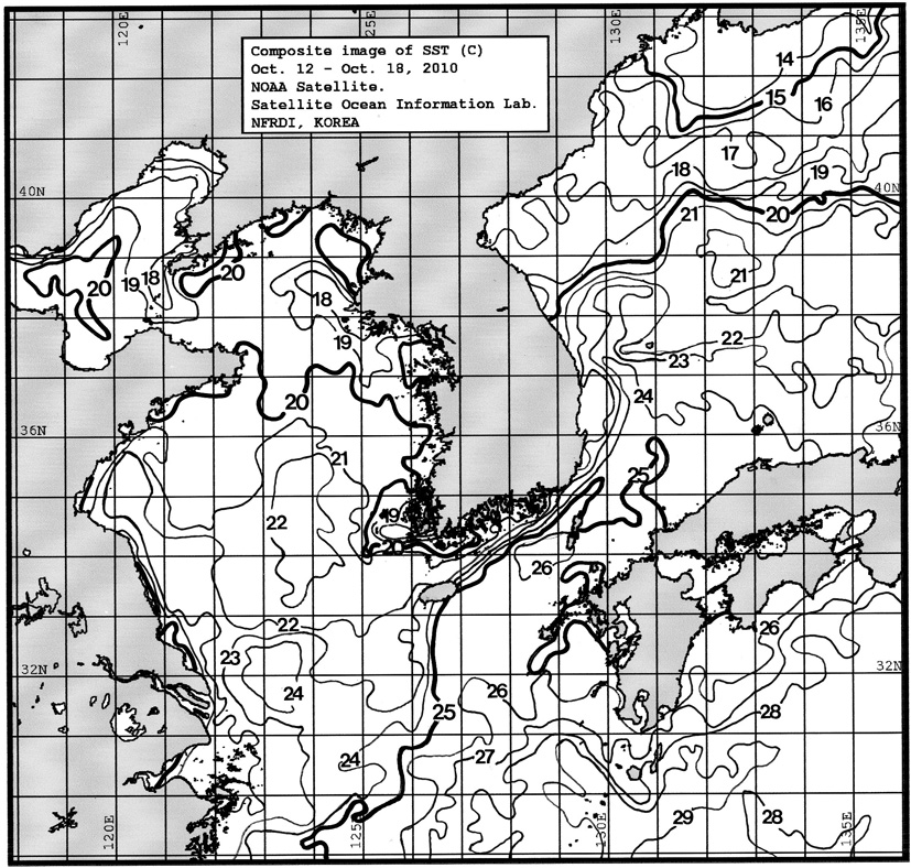 o 금주(2010.10.12~2010.10.18)의 한국근해 표면수온은 대화퇴 근해 21~22도, 울릉도 근해 21~22도, 대마도 근해 25~26도, 제주도 근해 22~25도, 이어도 근해 22~23도, 가거초 근해 20~21도, 어청도 근해 20~21도로 나타납니다. o「평년에 비해」대화퇴 근해 2.7도 높게, 울릉도 근해 0.8도 높게, 대마도 근해 1.9도 높게, 제주도 근해 0.6도 높게, 이어도 근해 0.6도 낮게, 가거초 근해 0.3도 높게, 어청도 근해는 1.5도 높게 나타납니다. o「전년에 비해」대화퇴 근해 1.0도 높게, 울릉도 근해 비슷하게, 대마도 근해 1.0도 높게, 제주도 근해 1.0도 낮게, 이어도 근해 1.5도 낮게, 가거초 근해 2.0도 낮게, 어청도 근해는 0.5도 낮게 나타납니다. o 수온 전선대는 우리나라 제주해협에서 대한해협까지 23도를 중심으로 형성됩니다.