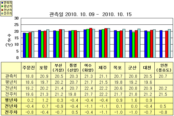 o 금주(2010.10.09~2010.10.15)의 한반도 연안 표면수온은 동해 연안역에서 섭씨 18.5~21.0도, 남해 연안역 20.0~21.5도, 서해 연안역에서 20.5~21.0도로 나타납니다. o 평년에 비해 동해 연안역은 0.5~1.0도 높게, 남해 연안역은 0.5도 낮게, 서해 연안역은 0.5~1.5도 높게 나타납니다. o 전년에 비해 포항 0.7도 높음을 제외한 동해 연안역은 0.5~1.0도 낮게, 남해 연안역은 0.5~1.0도 낮게, 대천 0.4도 낮음을 제외한 서해 연안역은 0.5도 높게 나타납니다.