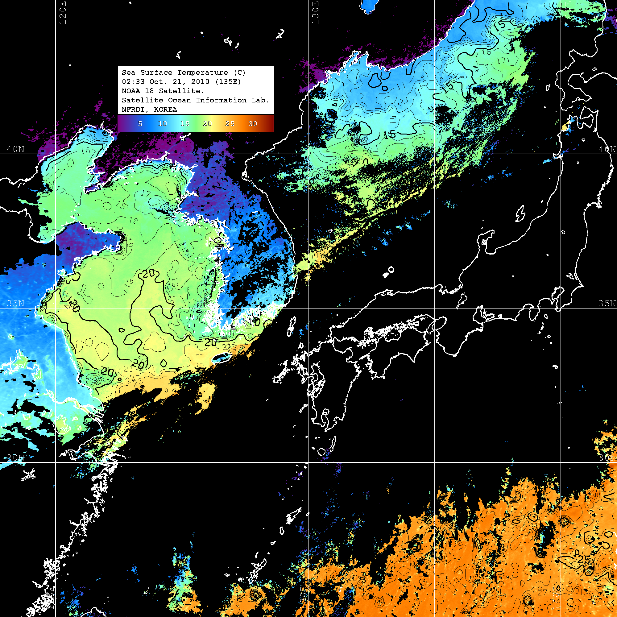 o 2010년 10월 21일 02시 33분 NOAA-18호 위성영상입니다. o 수온분포는 범례를 참고하시기 바랍니다. o 검은색은 구름을 나타냅니다. o 그림을 클릭하시면 크게 보실 수 있습니다.