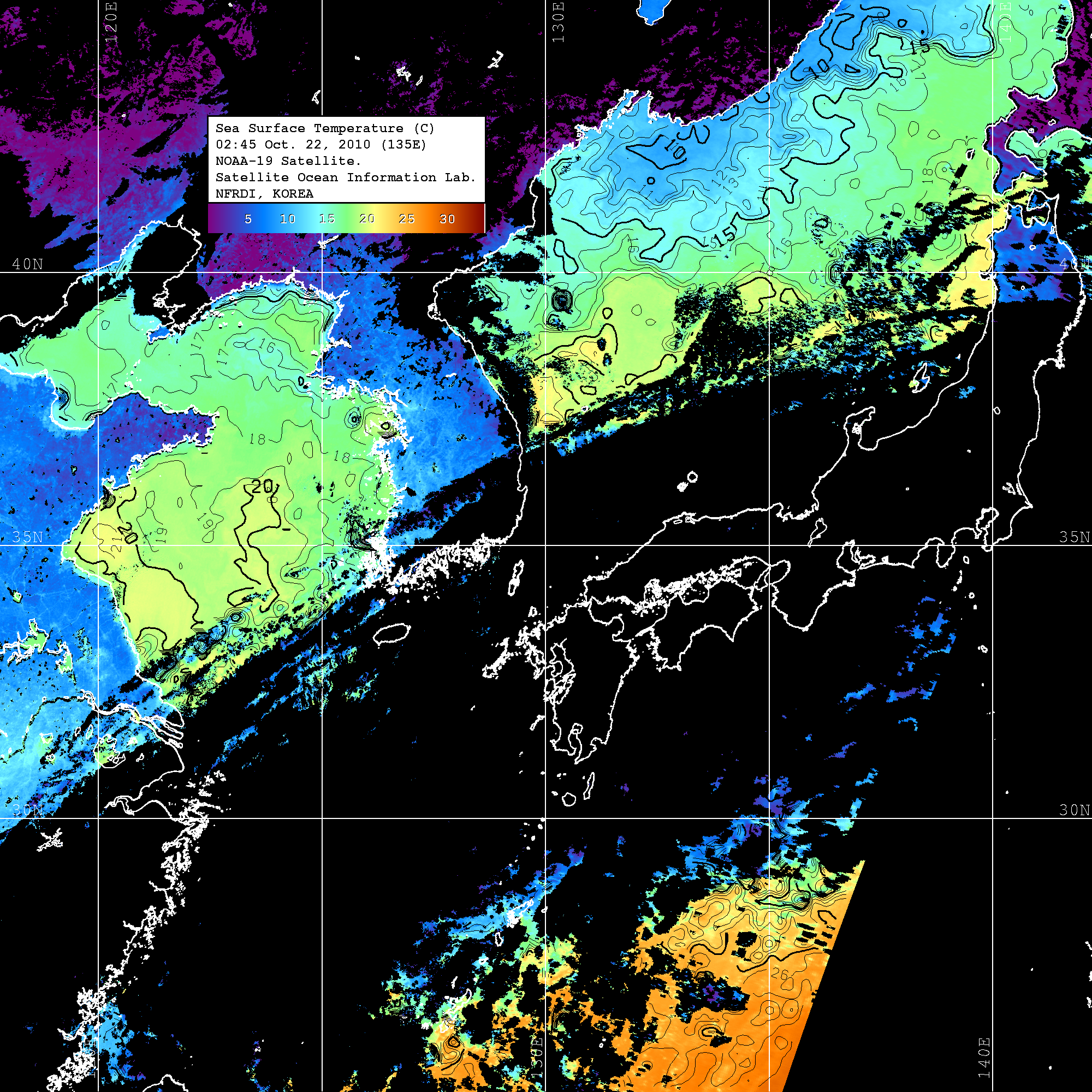 o 2010년 10월 22일 02시 45분 NOAA-19호 위성영상입니다. o 수온분포는 범례를 참고하시기 바랍니다. o 검은색은 구름을 나타냅니다. o 그림을 클릭하시면 크게 보실 수 있습니다.