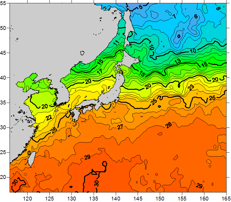 o 2010년 10월 21일 북서태평양 광역해양 수온분포 입니다. o 아래 위성 수온분포도는 국립수산과학원(NFRDI, Korea)과 일본동북대학교 (Tohoku University, Japan)가 공동연구개발 진행중, 1차 연구결과인 것으로 구름의 영향을 배제한 신기술의 수온정보입니다.