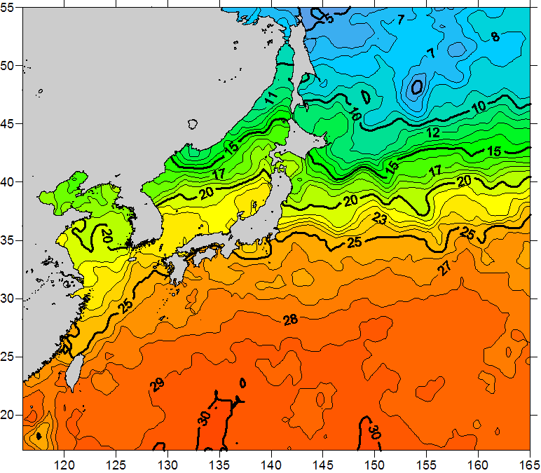 o 2010년 10월 22일 북서태평양 광역해양 수온분포 입니다. o 아래 위성 수온분포도는 국립수산과학원(NFRDI, Korea)과 일본동북대학교 (Tohoku University, Japan)가 공동연구개발 진행중, 1차 연구결과인 것으로 구름의 영향을 배제한 신기술의 수온정보입니다.