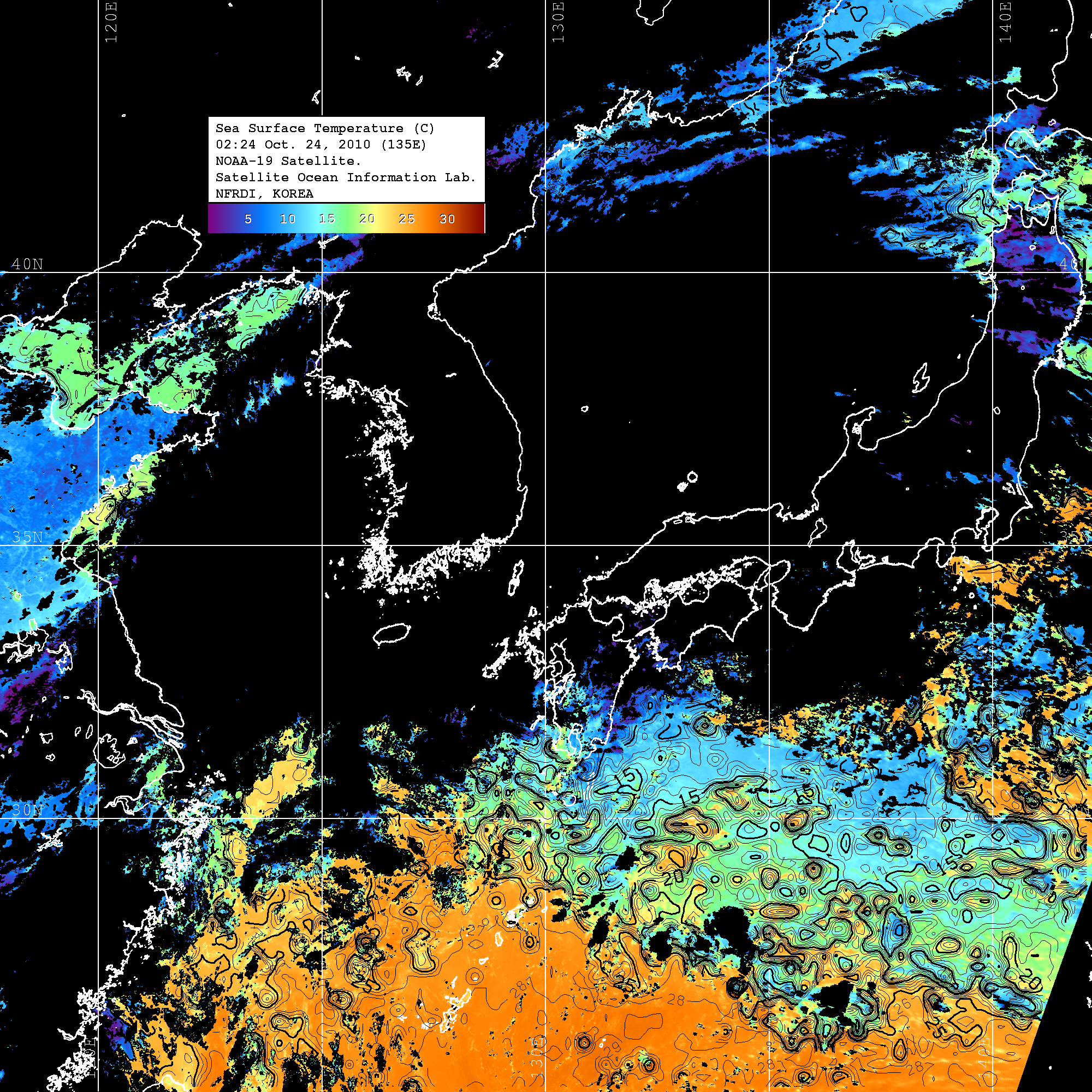 o 2010년 10월 24일 02시 24분 NOAA-19호 위성영상입니다. o 수온분포는 범례를 참고하시기 바랍니다. o 검은색은 구름을 나타냅니다. o 그림을 클릭하시면 크게 보실 수 있습니다.