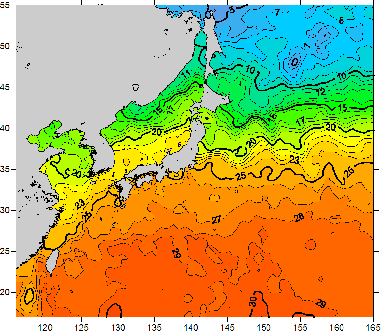 o 2010년 10월 23일 북서태평양 광역해양 수온분포 입니다. o 아래 위성 수온분포도는 국립수산과학원(NFRDI, Korea)과 일본동북대학교 (Tohoku University, Japan)가 공동연구개발 진행중, 1차 연구결과인 것으로 구름의 영향을 배제한 신기술의 수온정보입니다.