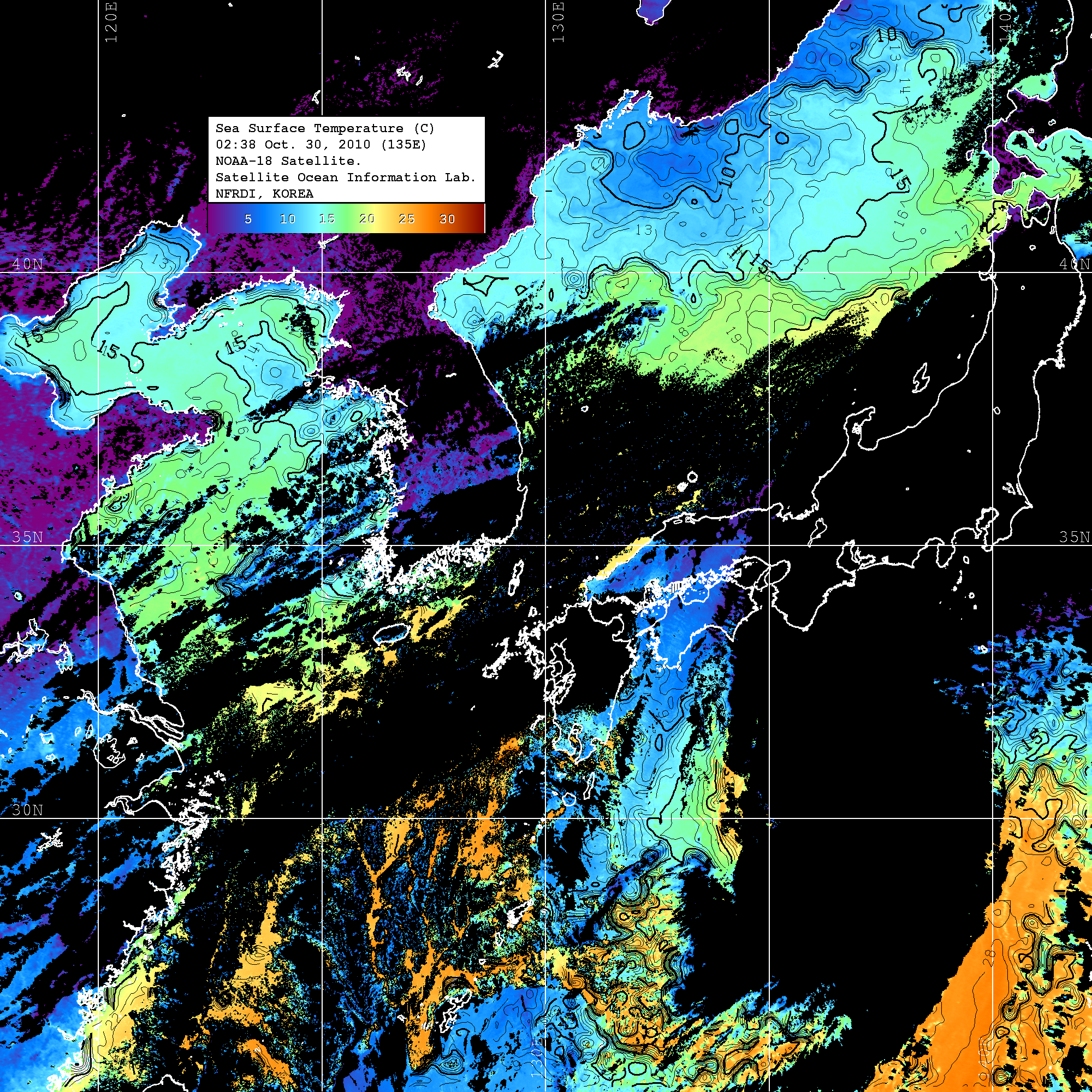 o 2010년 10월 30일 02시 38분 NOAA-18호 위성영상입니다. o 수온분포는 범례를 참고하시기 바랍니다. o 검은색은 구름을 나타냅니다. o 그림을 클릭하시면 크게 보실 수 있습니다.