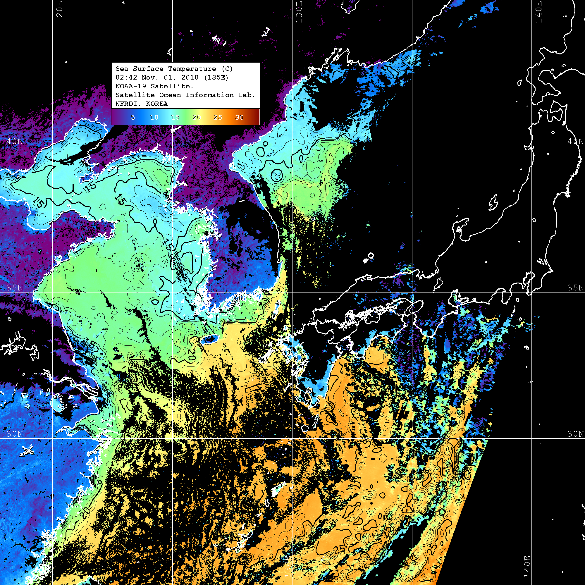 o 2010년 11월 01일 02시 42분 NOAA-19호 위성영상입니다. o 수온분포는 범례를 참고하시기 바랍니다. o 검은색은 구름을 나타냅니다. o 그림을 클릭하시면 크게 보실 수 있습니다.