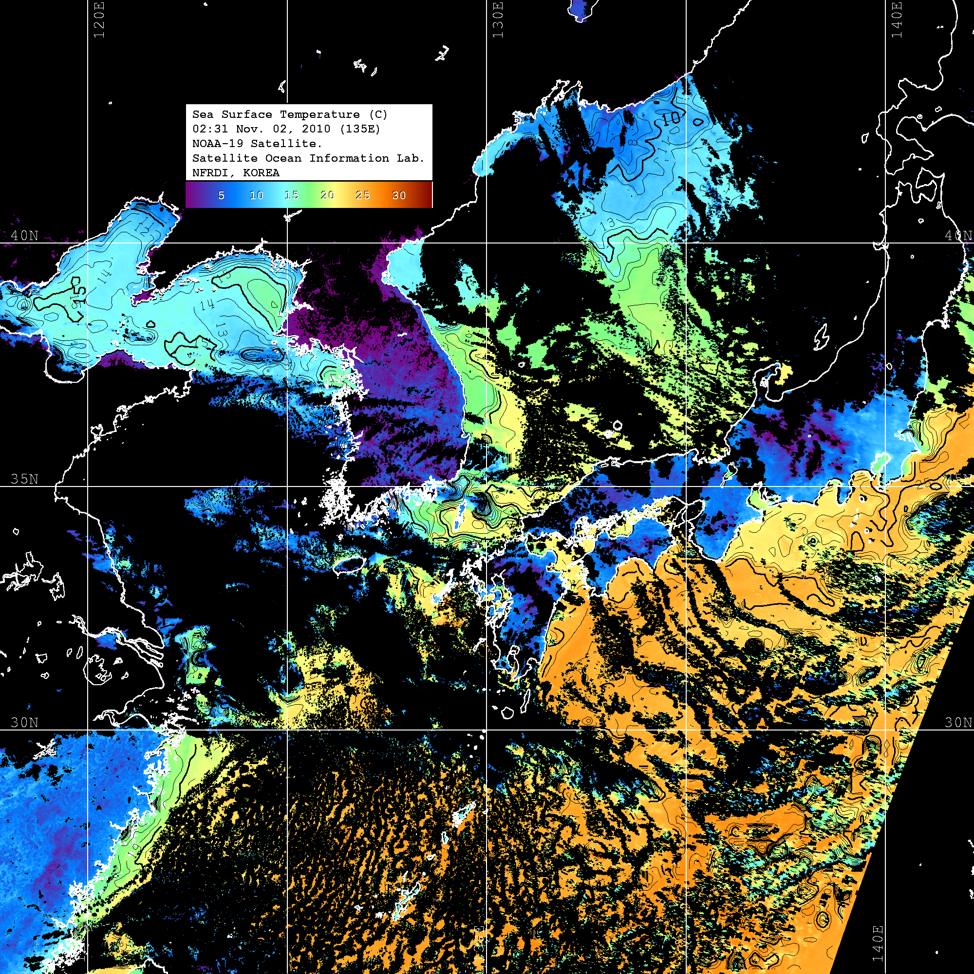 o 2010년 11월 02일 02시 31분 NOAA-19호 위성영상입니다. o 수온분포는 범례를 참고하시기 바랍니다. o 검은색은 구름을 나타냅니다. o 그림을 클릭하시면 크게 보실 수 있습니다.