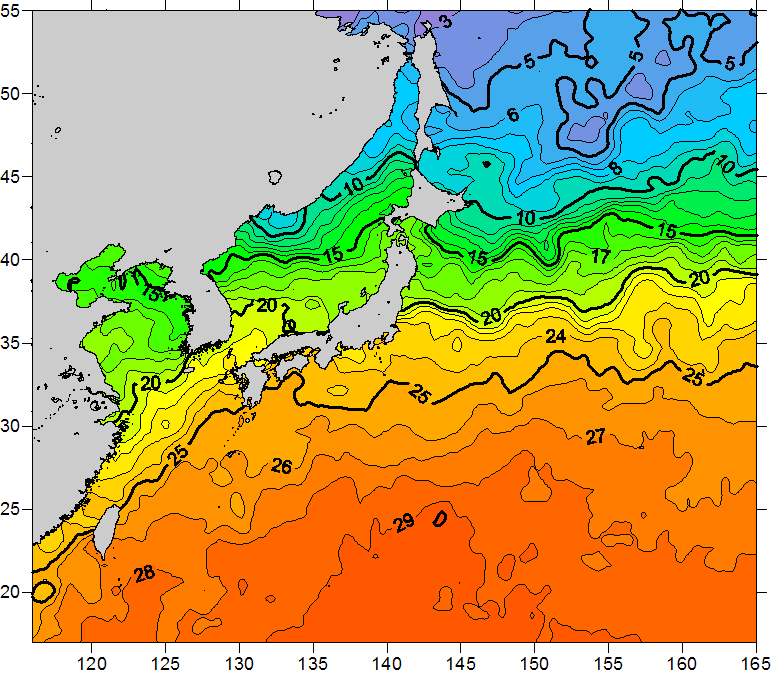 o 2010년 11월 03일 북서태평양 광역해양 수온분포 입니다. o 아래 위성 수온분포도는 국립수산과학원(NFRDI, Korea)과 일본동북대학교 (Tohoku University, Japan)가 공동연구개발 진행중, 1차 연구결과인 것으로 구름의 영향을 배제한 신기술의 수온정보입니다.