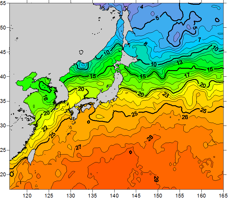 o 2010년 11월 04일 북서태평양 광역해양 수온분포 입니다. o 아래 위성 수온분포도는 국립수산과학원(NFRDI, Korea)과 일본동북대학교 (Tohoku University, Japan)가 공동연구개발 진행중, 1차 연구결과인 것으로 구름의 영향을 배제한 신기술의 수온정보입니다.