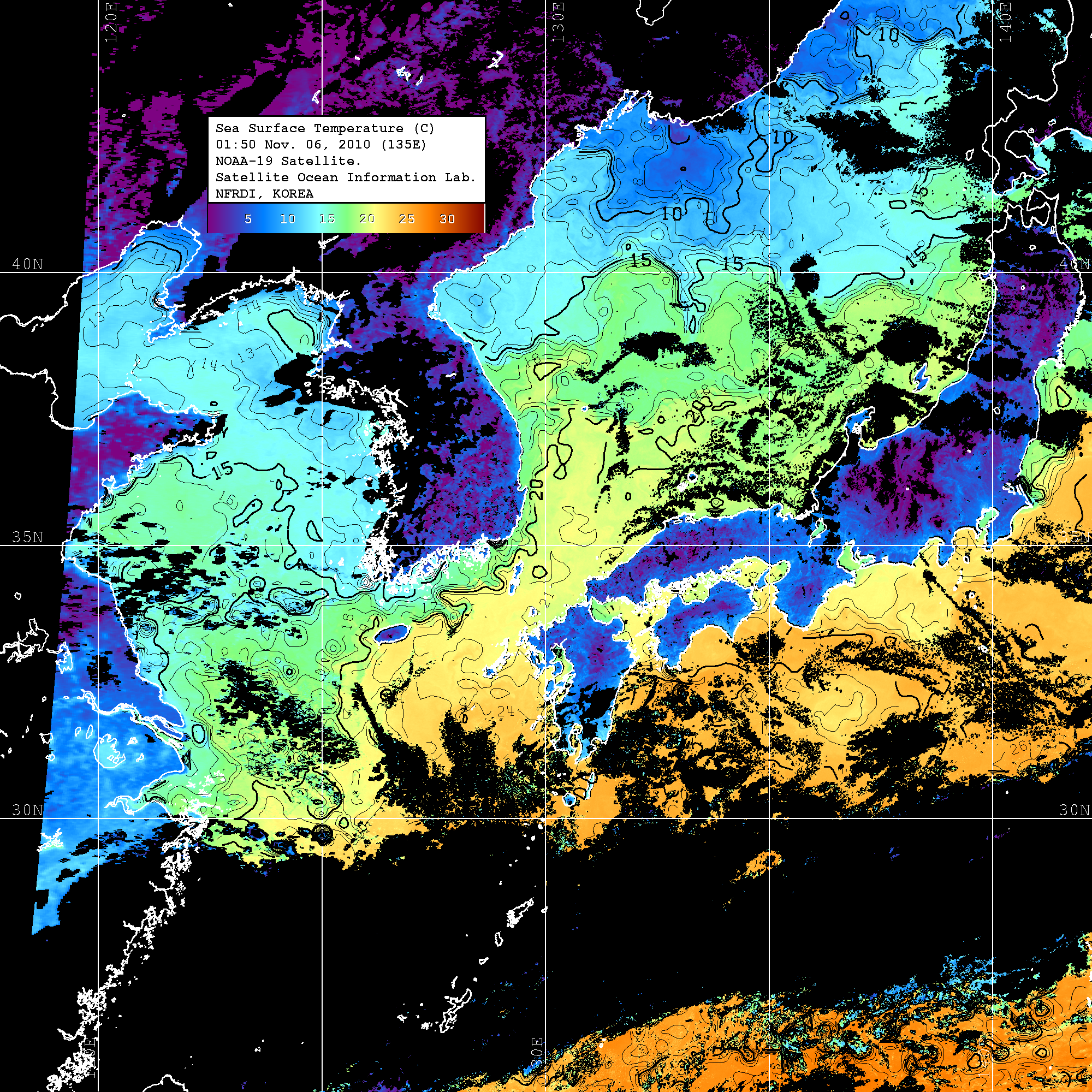 o 2010년 11월 06일 01시 50분 NOAA-19호 위성영상입니다. o 수온분포는 범례를 참고하시기 바랍니다. o 검은색은 구름을 나타냅니다. o 그림을 클릭하시면 크게 보실 수 있습니다.