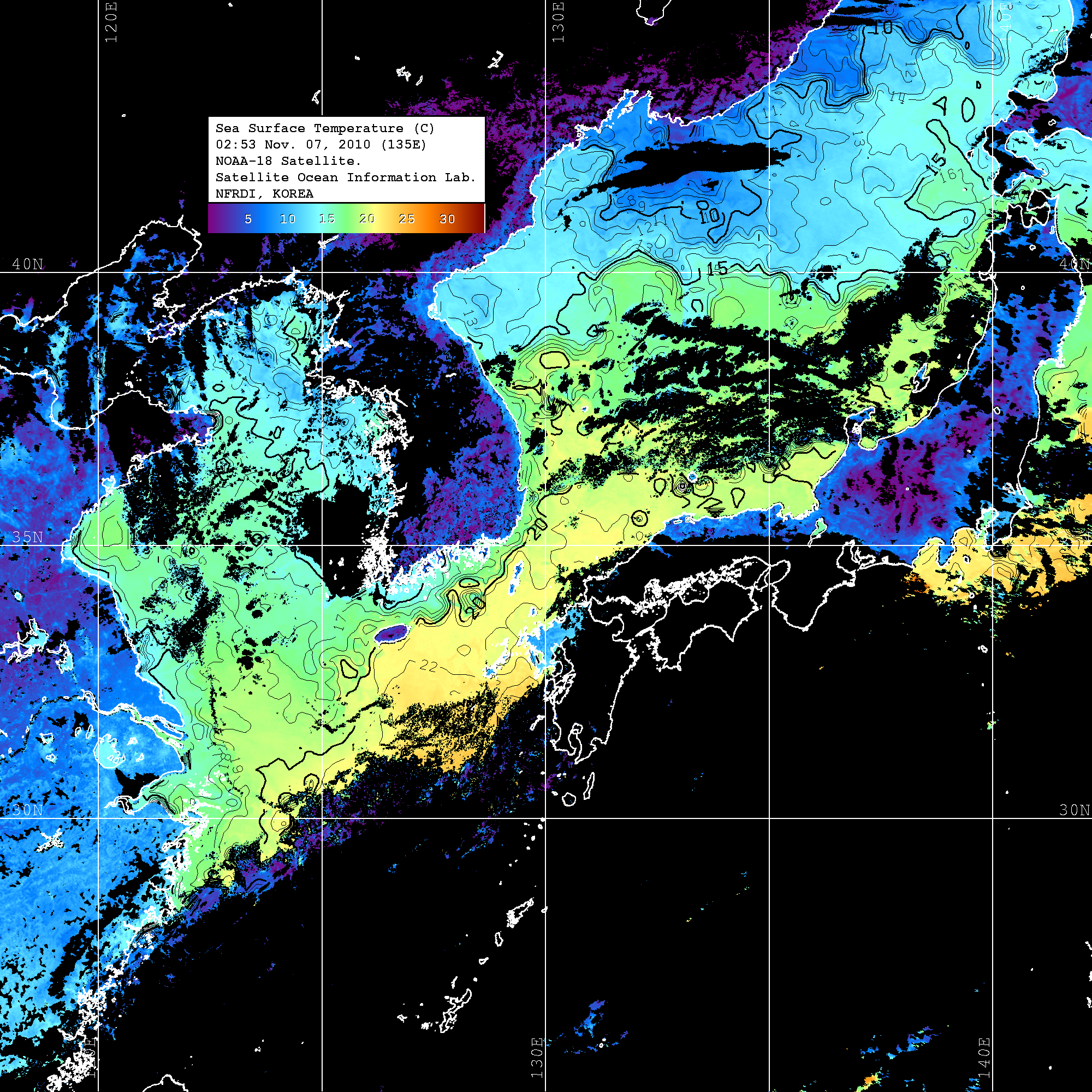 o 2010년 11월 07일 02시 53분 NOAA-18호 위성영상입니다. o 수온분포는 범례를 참고하시기 바랍니다. o 검은색은 구름을 나타냅니다. o 그림을 클릭하시면 크게 보실 수 있습니다.