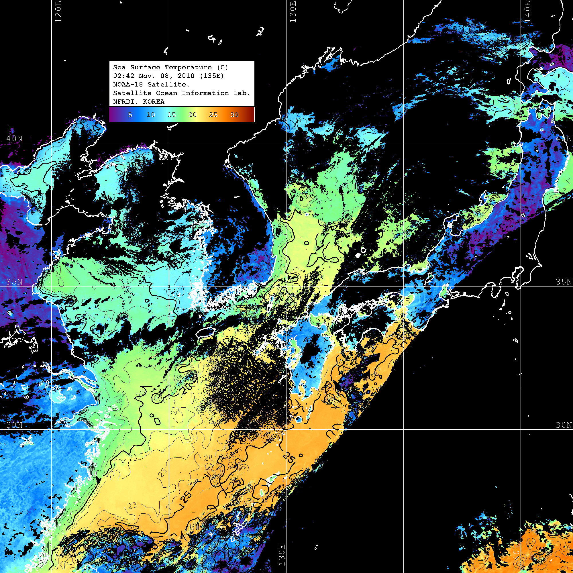 o 2010년 11월 08일 02시 42분 NOAA-18호 위성영상입니다. o 수온분포는 범례를 참고하시기 바랍니다. o 검은색은 구름을 나타냅니다. o 그림을 클릭하시면 크게 보실 수 있습니다.