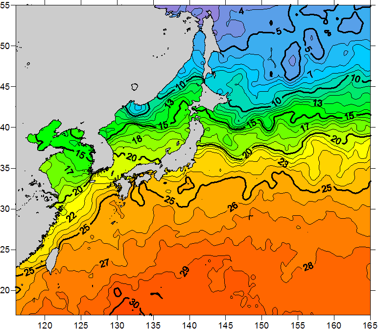 o 2010년 11월 08일 북서태평양 광역해양 수온분포 입니다. o 아래 위성 수온분포도는 국립수산과학원(NFRDI, Korea)과 일본동북대학교 (Tohoku University, Japan)가 공동연구개발 진행중, 1차 연구결과인 것으로 구름의 영향을 배제한 신기술의 수온정보입니다.
