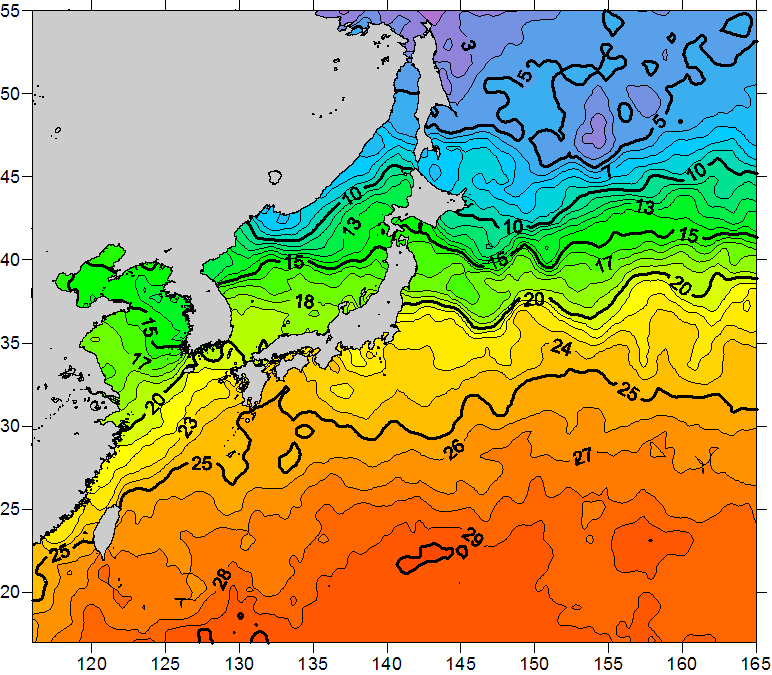 o 2010년 11월 10일 북서태평양 광역해양 수온분포 입니다. o 아래 위성 수온분포도는 국립수산과학원(NFRDI, Korea)과 일본동북대학교 (Tohoku University, Japan)가 공동연구개발 진행중, 1차 연구결과인 것으로 구름의 영향을 배제한 신기술의 수온정보입니다.