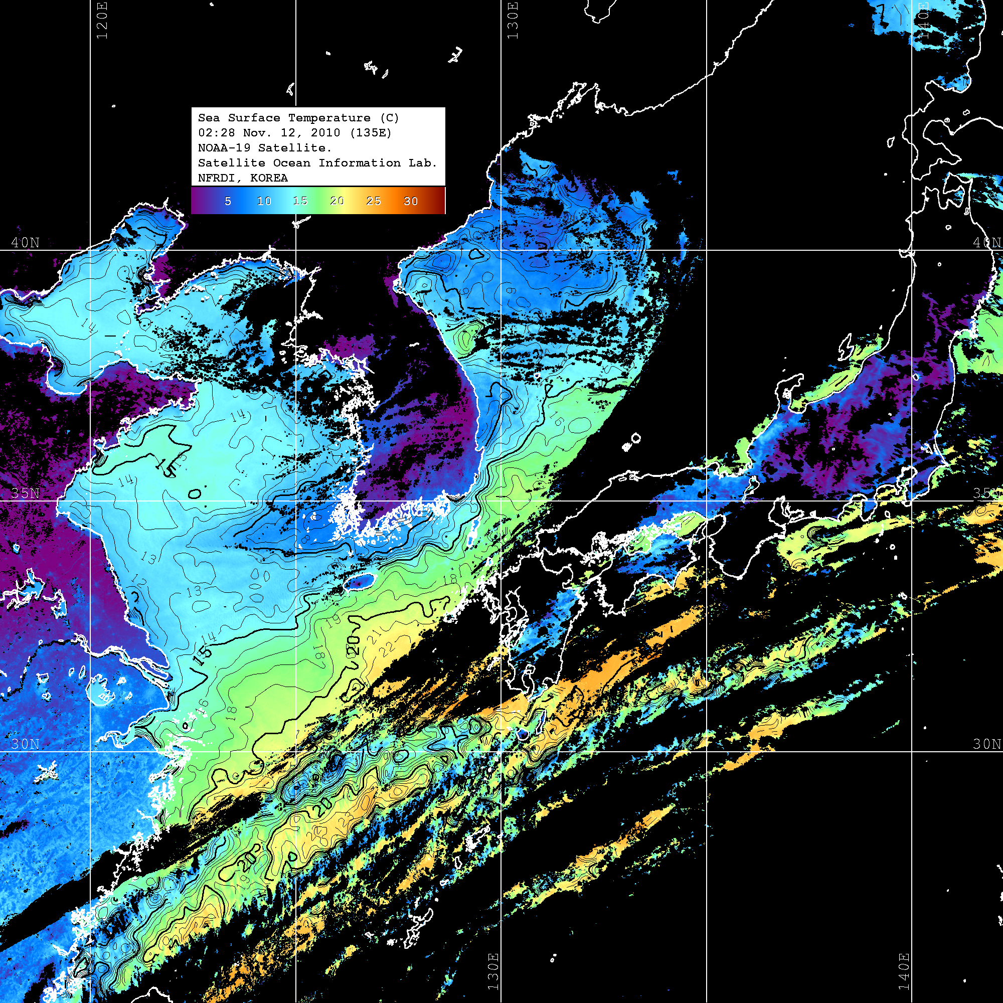 o 2010년 11월 12일 02시 28분 NOAA-19호 위성영상입니다. o 수온분포는 범례를 참고하시기 바랍니다. o 검은색은 구름을 나타냅니다. o 그림을 클릭하시면 크게 보실 수 있습니다.