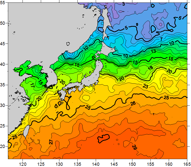 o 2010년 11월 11일 북서태평양 광역해양 수온분포 입니다. o 아래 위성 수온분포도는 국립수산과학원(NFRDI, Korea)과 일본동북대학교 (Tohoku University, Japan)가 공동연구개발 진행중, 1차 연구결과인 것으로 구름의 영향을 배제한 신기술의 수온정보입니다.