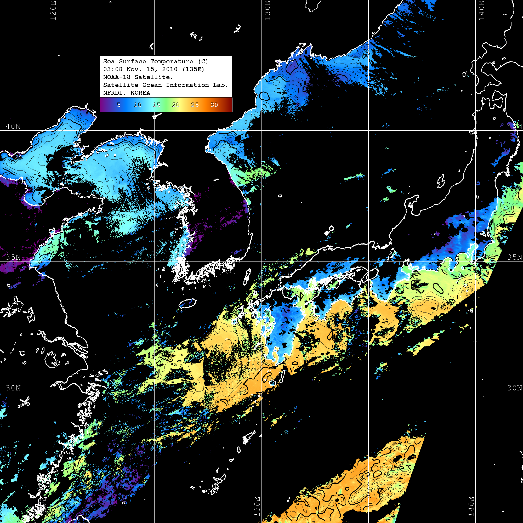 o 2010년 11월 15일 03시 08분 NOAA-18호 위성영상입니다. o 수온분포는 범례를 참고하시기 바랍니다. o 검은색은 구름을 나타냅니다. o 그림을 클릭하시면 크게 보실 수 있습니다.