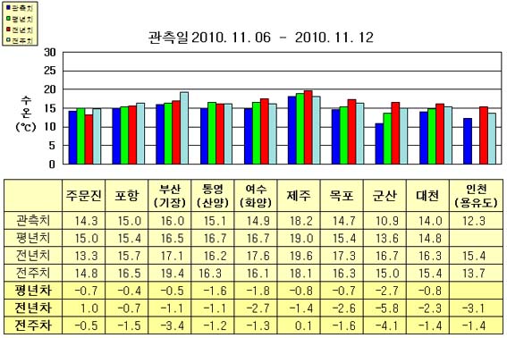 o 금주(2010.11.06~2010.11.12)의 한반도 연안 표면수온은 동해 연안역에서 섭씨 14.0~16.0도, 남해 연안역 14.5~18.5도, 서해 연안역에서 10.5~15.0도로 나타납니다. o 평년에 비해 동해 연안역은 0.5~1.0도 낮게, 남해 연안역은 0.5~2.0도 낮게, 서해 연안역은 0.5~3.0도 낮게 나타납니다. o 전년에 비해 주문진 1.0도 높음을 제외한 동해 연안역은 0.5~1.0도 낮게, 남해 연안역은 1.0~3.0도 낮게, 서해 연안역은 2.0~6.0도 낮게 나타납니다.