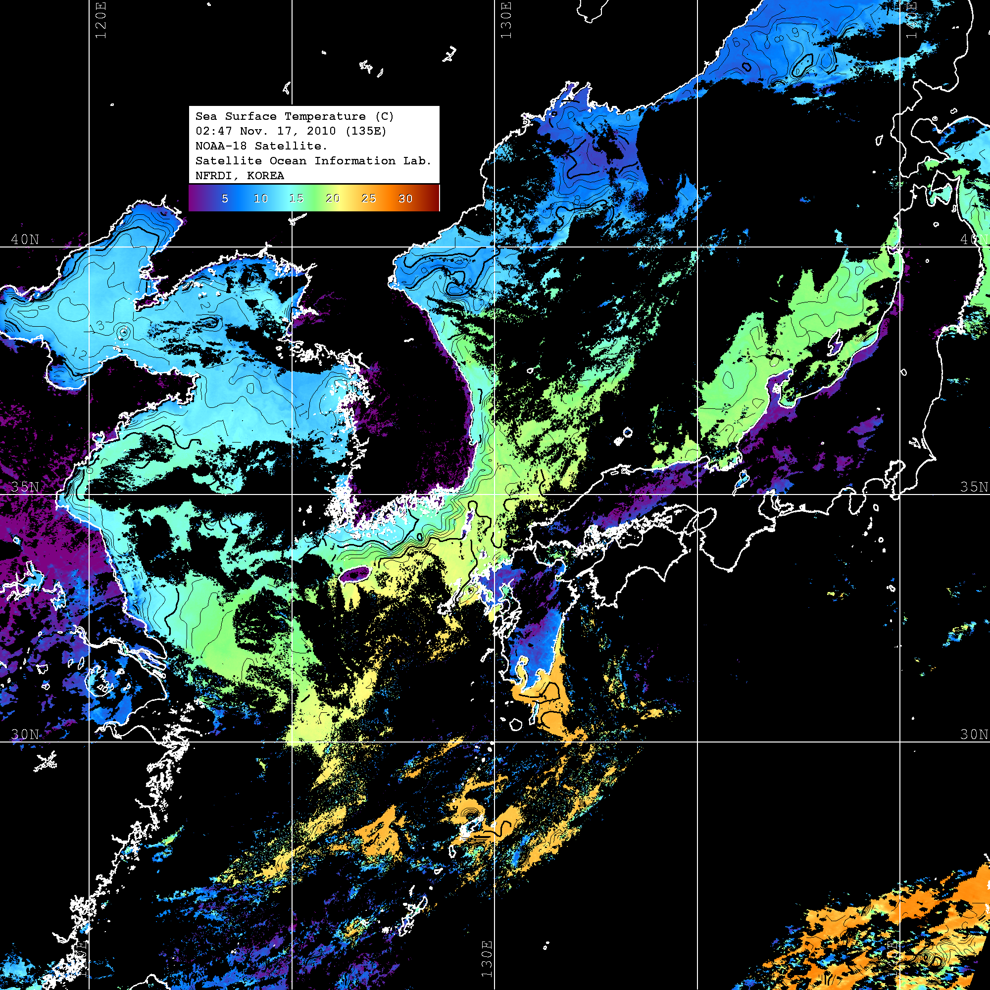 o 2010년 11월 17일 02시 47분 NOAA-18호 위성영상입니다. o 수온분포는 범례를 참고하시기 바랍니다. o 검은색은 구름을 나타냅니다. o 그림을 클릭하시면 크게 보실 수 있습니다.
