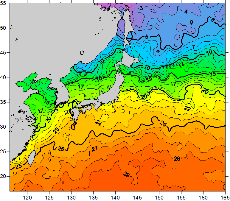 o 2010년 11월 17일 북서태평양 광역해양 수온분포 입니다. o 아래 위성 수온분포도는 국립수산과학원(NFRDI, Korea)과 일본동북대학교 (Tohoku University, Japan)가 공동연구개발 진행중, 1차 연구결과인 것으로 구름의 영향을 배제한 신기술의 수온정보입니다.