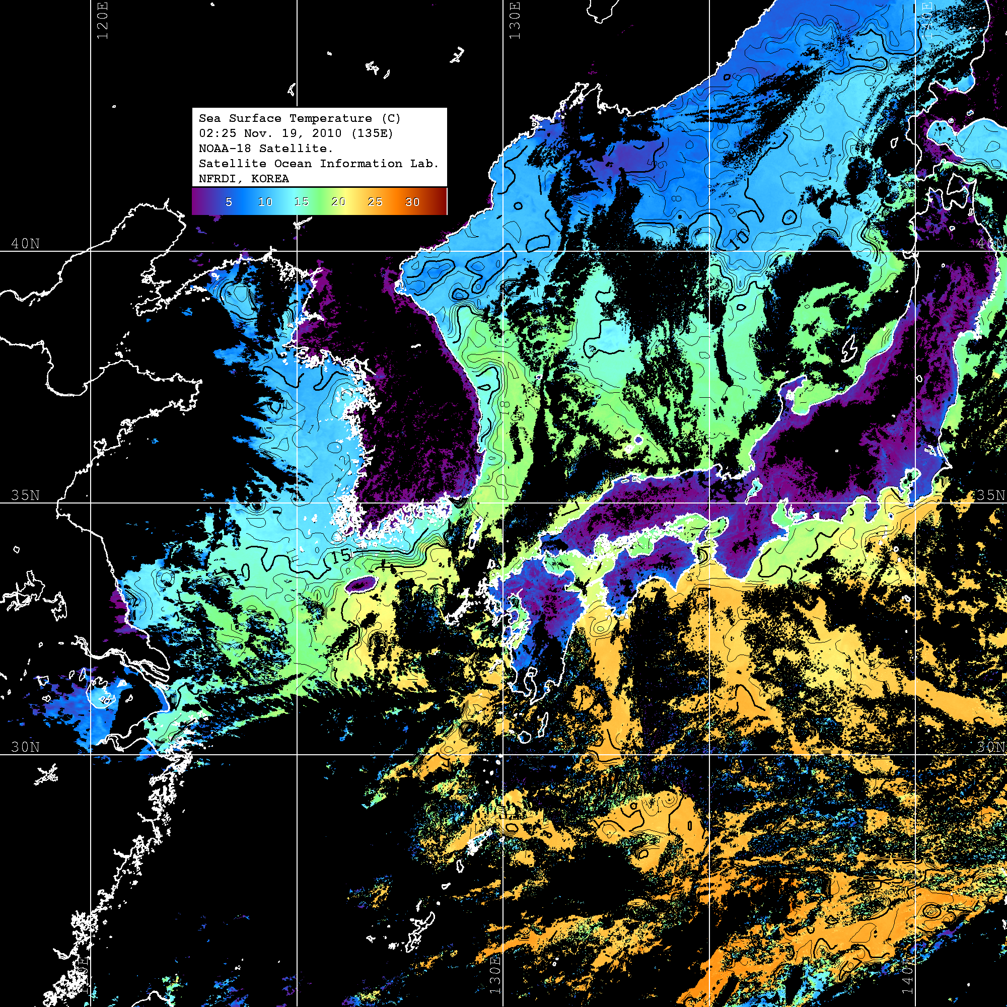 o 2010년 11월 19일 02시 25분 NOAA-18호 위성영상입니다. o 수온분포는 범례를 참고하시기 바랍니다. o 검은색은 구름을 나타냅니다. o 그림을 클릭하시면 크게 보실 수 있습니다.