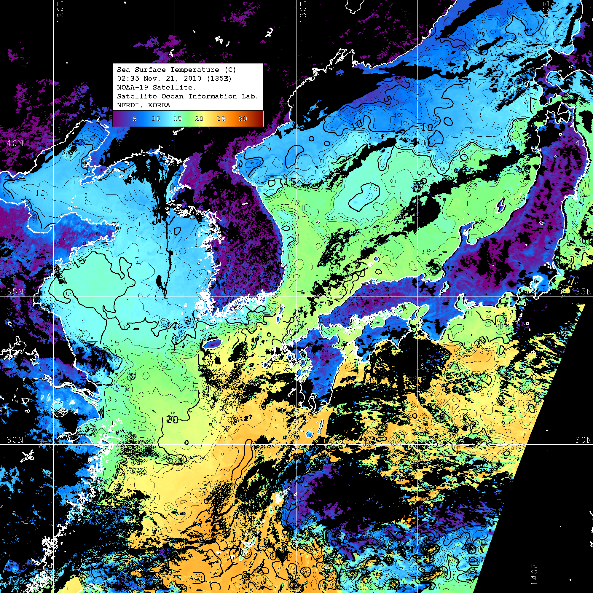 o 2010년 11월 21일 02시 35분 NOAA-19호 위성영상입니다. o 수온분포는 범례를 참고하시기 바랍니다. o 검은색은 구름을 나타냅니다. o 그림을 클릭하시면 크게 보실 수 있습니다.