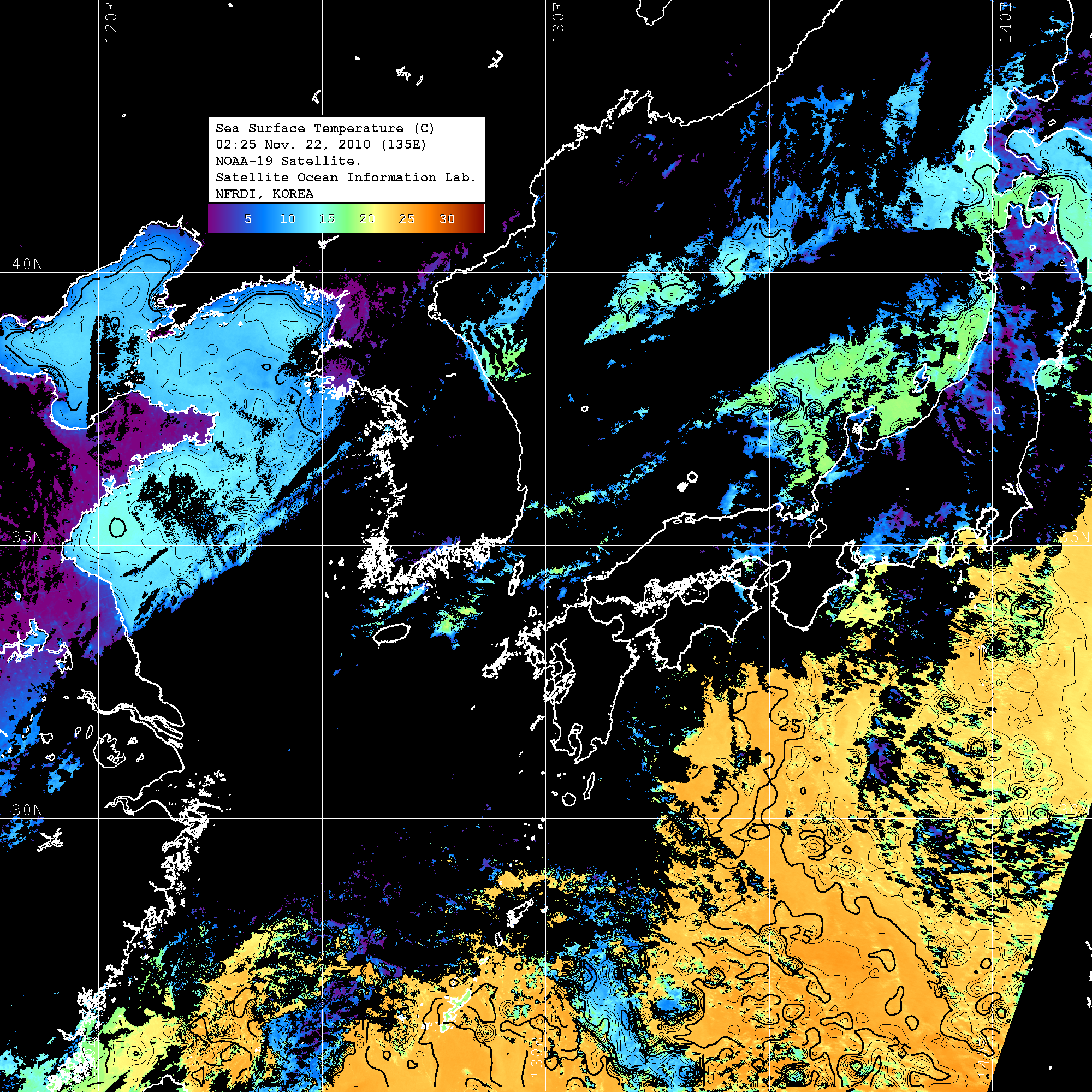 o 2010년 11월 22일 02시 25분 NOAA-19호 위성영상입니다. o 수온분포는 범례를 참고하시기 바랍니다. o 검은색은 구름을 나타냅니다. o 그림을 클릭하시면 크게 보실 수 있습니다.