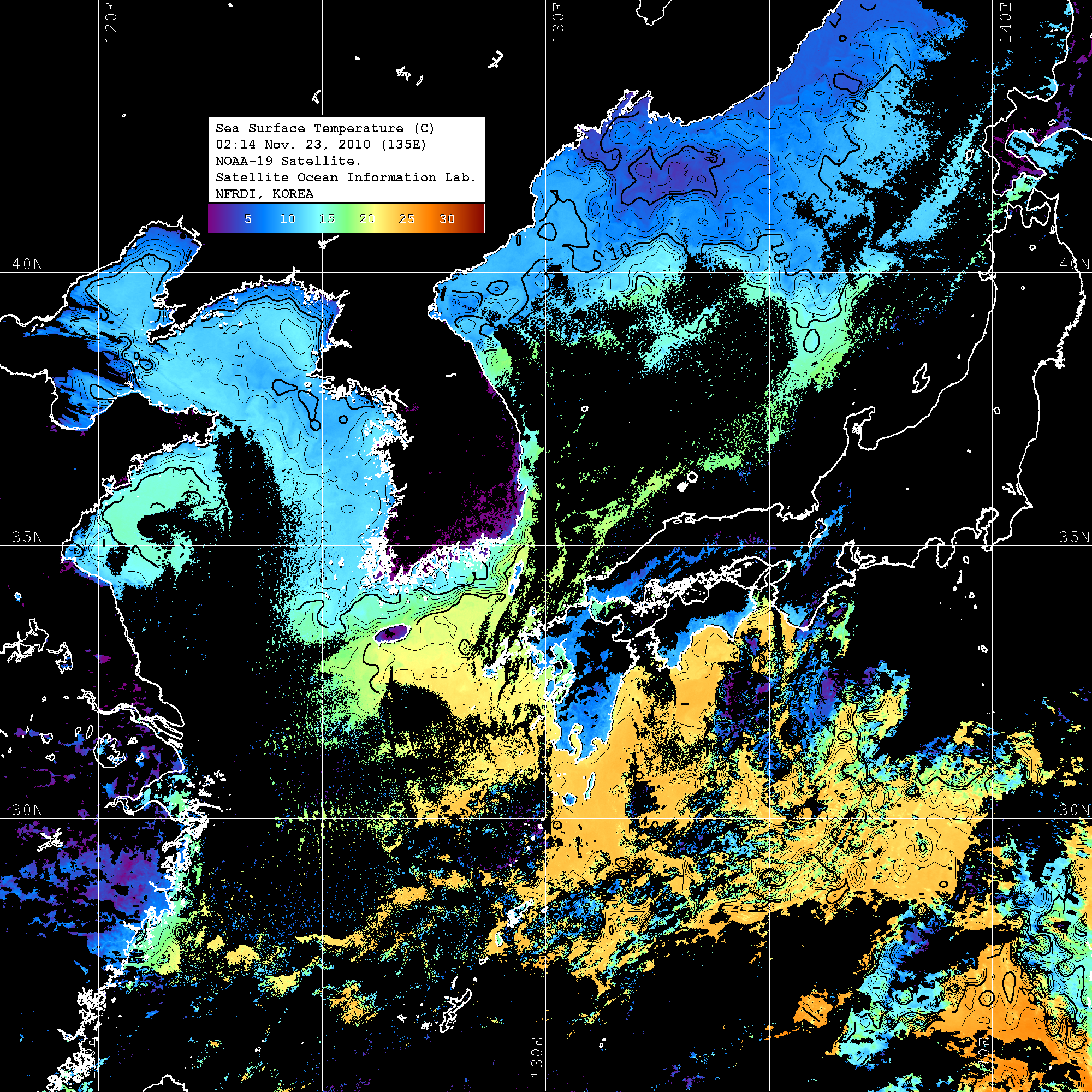 o 2010년 11월 23일 02시 14분 NOAA-19호 위성영상입니다. o 수온분포는 범례를 참고하시기 바랍니다. o 검은색은 구름을 나타냅니다. o 그림을 클릭하시면 크게 보실 수 있습니다.