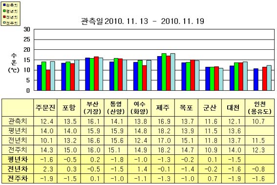 o 금주(2010.11.13~2010.11.19)의 한반도 연안 표면수온은 동해 연안역에서 섭씨 12.0~16.0도, 남해 연안역 13.5~17.0도, 서해 연안역에서 10.5~13.5도로 나타납니다. o 평년에 비해 부산(기장) 비슷함을 제외한 동해 연안역은 0.5~1.5도 낮게, 남해 연안역은 1.0~2.0도 낮게, 대천 1.5도 낮음을 제외한 서해 연안역은 비슷하게 나타납니다. o 전년에 비해 부산(기장) 0.5도 낮음을 제외한 동해 연안역은 0.5~2.5도 높게, 여수(화양) 1.4도 높음을 제외한 남해 연안역은 0.5~1.5도 낮게, 서해 연안역은 0.5~1.5도 낮게 나타납니다.