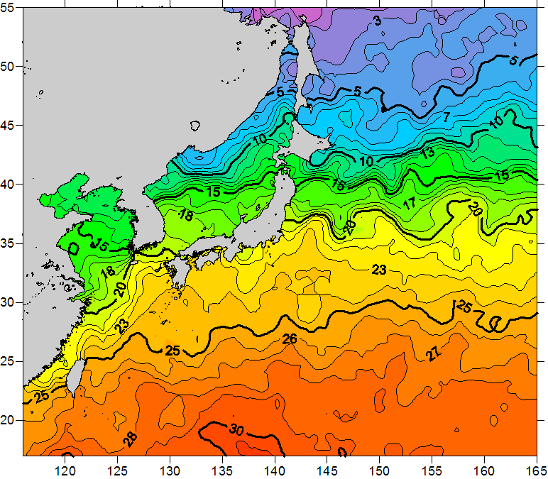o 2010년 11월 22일 북서태평양 광역해양 수온분포 입니다. o 아래 위성 수온분포도는 국립수산과학원(NFRDI, Korea)과 일본동북대학교 (Tohoku University, Japan)가 공동연구개발 진행중, 1차 연구결과인 것으로 구름의 영향을 배제한 신기술의 수온정보입니다.