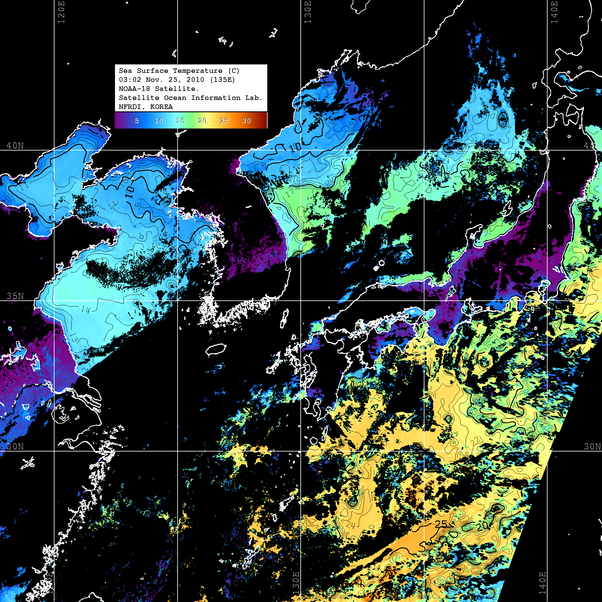 o 2010년 11월 25일 03시 02분 NOAA-18호 위성영상입니다. o 수온분포는 범례를 참고하시기 바랍니다. o 검은색은 구름을 나타냅니다. o 그림을 클릭하시면 크게 보실 수 있습니다.